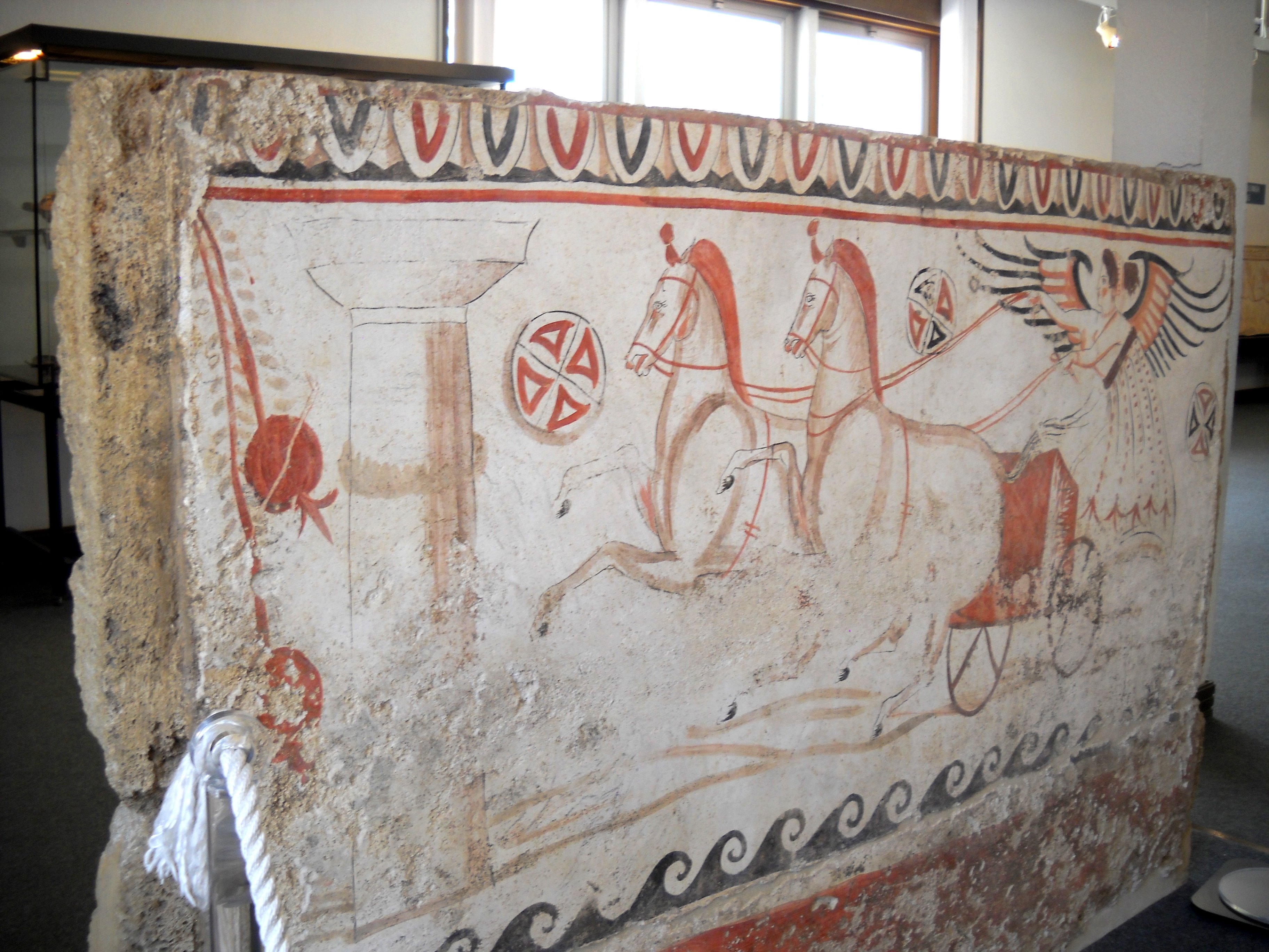 Paestum Museum tomb painting Posted on November 18, 2014 by Janet Simmonds Reading time less than 1 minute Tomb 86, Paestum around Andriuolo (330-320 BC) – north wall (same as south). Winged victory. Paestum