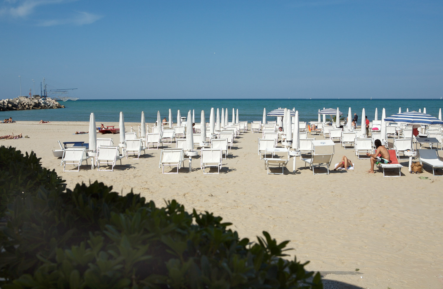 The eight miles of ‘velvet beach’ mentioned in every tourist brochure is difficult to appreciate on account of the wind, which has strengthened  to a respectable gale. The waves crash on to the beach and whip the sand into small eddies of dust.  Senigallia has an art deco pier ‘La Rotonda’ which is impressive, stretching out to sea like a 1930s liner about to set sail for Dubrovnik or Venice.  Each summer La Rotonda hosts a ‘street food’ festival. The local chefs all participate – at least two of them have Michelin stars.