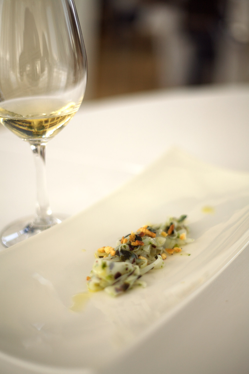 Next came a wonderful dish of water melon, honeydew melon and white fish. The melon was actually pureed melon that had been frozen and shaped into tiny globes, the sensation of the textures was divine. Once again the fish was fresh, as the Italians say ‘freschissimo’. There was a light couscous base that provided a gritty texture to the dish, one of the young chefs later explained it as ‘the sensation of sand between your toes when you go to the beach as a child’. As he described this sensation his eyes became moist with nostalgia and emotion.