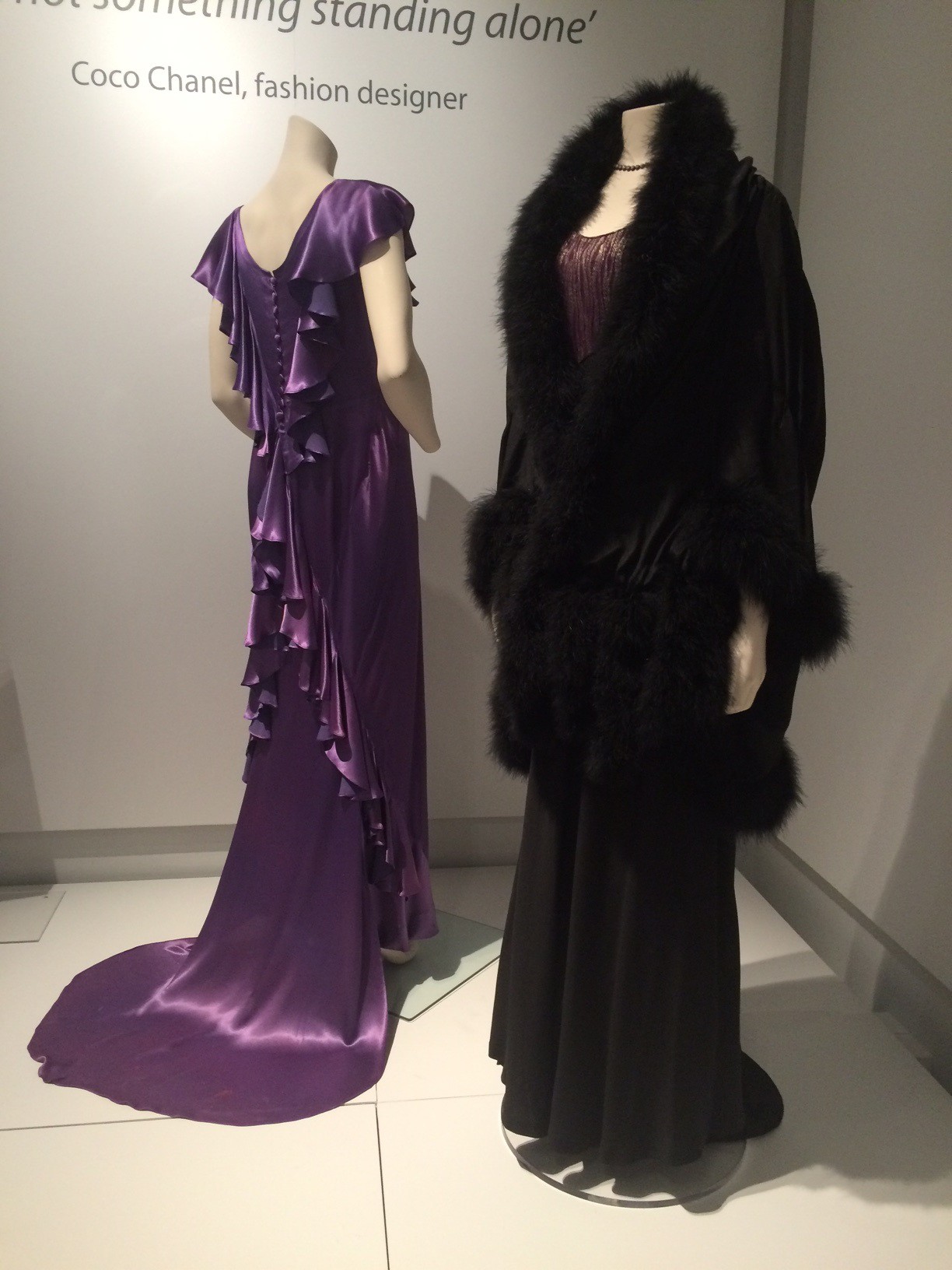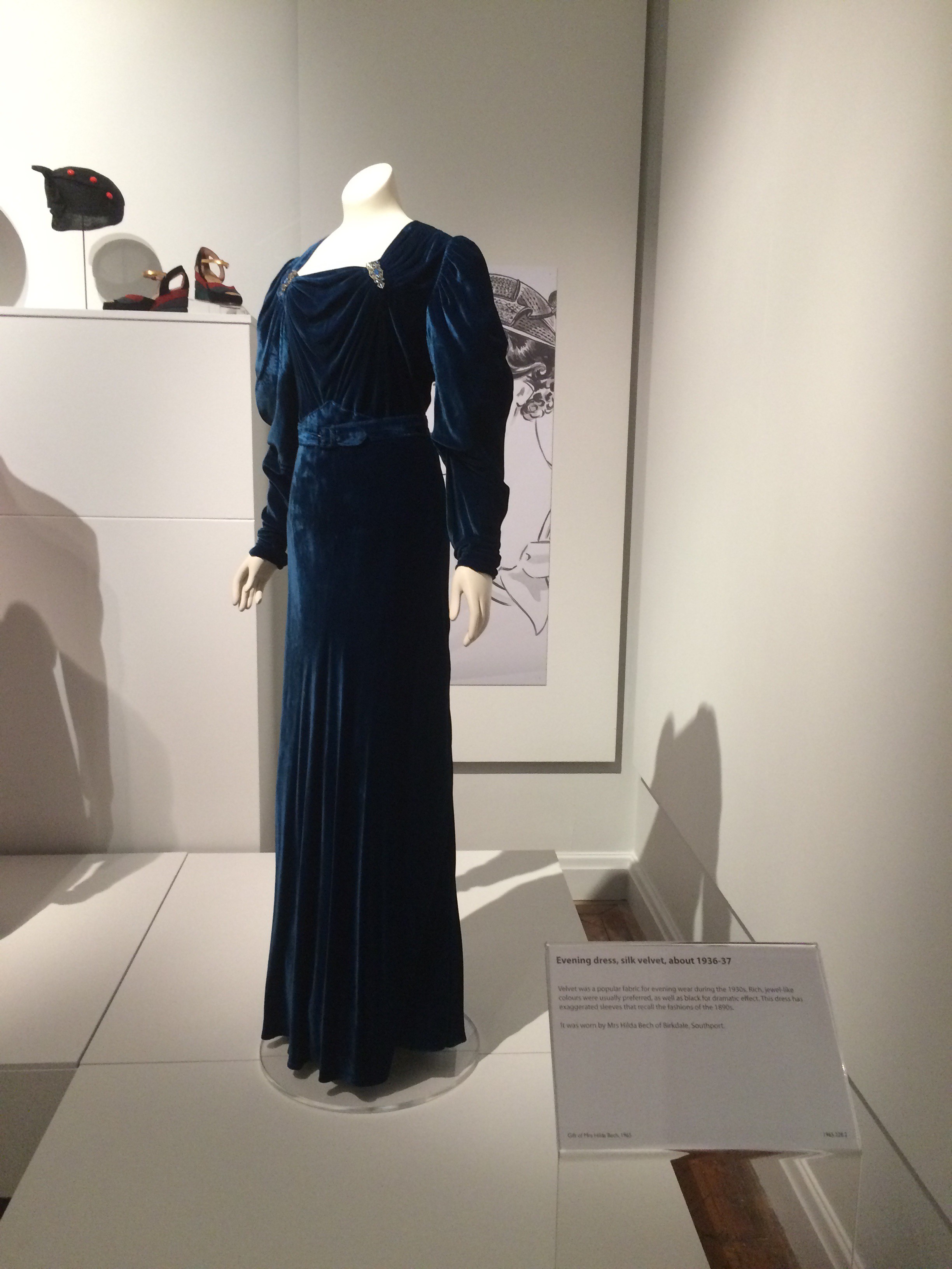 I was mesmerised by a midnight blue velvet evening gown in the exhibiton. I was wondering if it would fit me, probably not. It had a simple scoop neckline, long sleeves, fitted waistline and finished delicately at the ankle. Elegant, simple, stunning. I started to read about the dress on the display card. The card read……A gift from Mrs Hilda Bech of Birkdale, Southport…..I couldn’t believe it. I almost spluttered with surprise. Mrs Bech, the very ancient old lady who used to live next door to me had given this dress to Liverpool Museum in 1964. The exact year that my sister and I had started peering over the hedge or around the gate to observe our totally ancient neighbours. The same Mrs Bech who’d kindly given me her bike. I actually went back to the gallery a few days later. It turns out that not one but two of the dresses in the exhibition were given to the Liverpool Museum by Mrs Bech in the 1960s. The two outfits belonging to Mrs Bech are shown here.