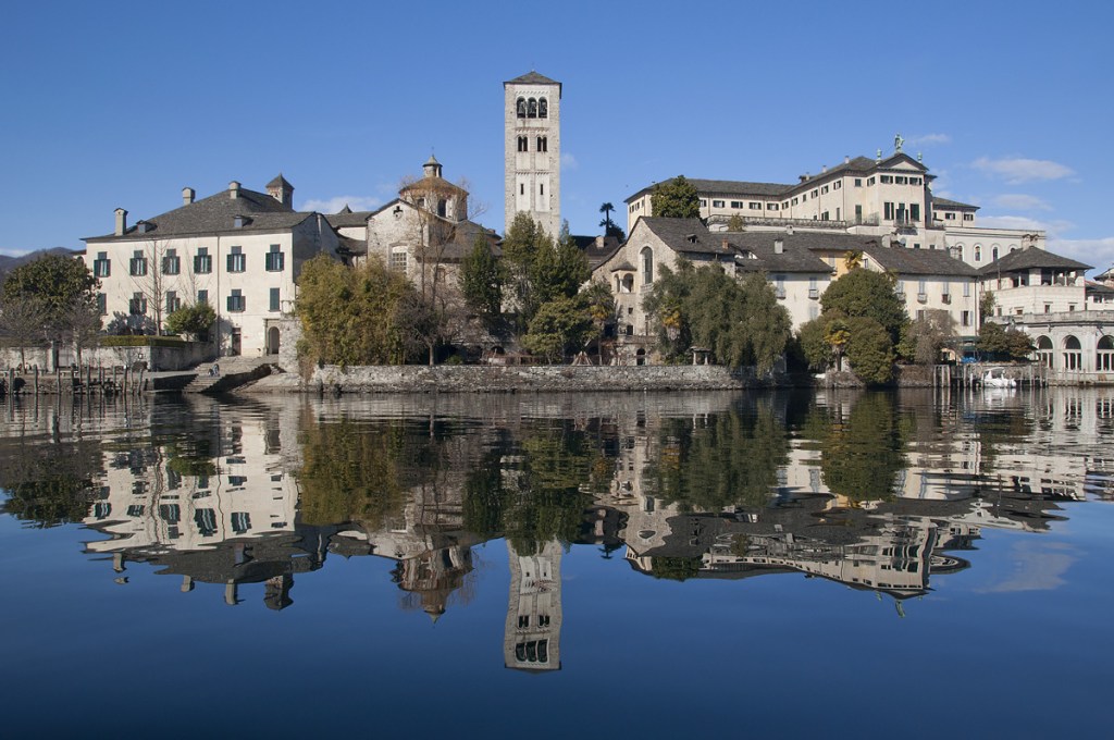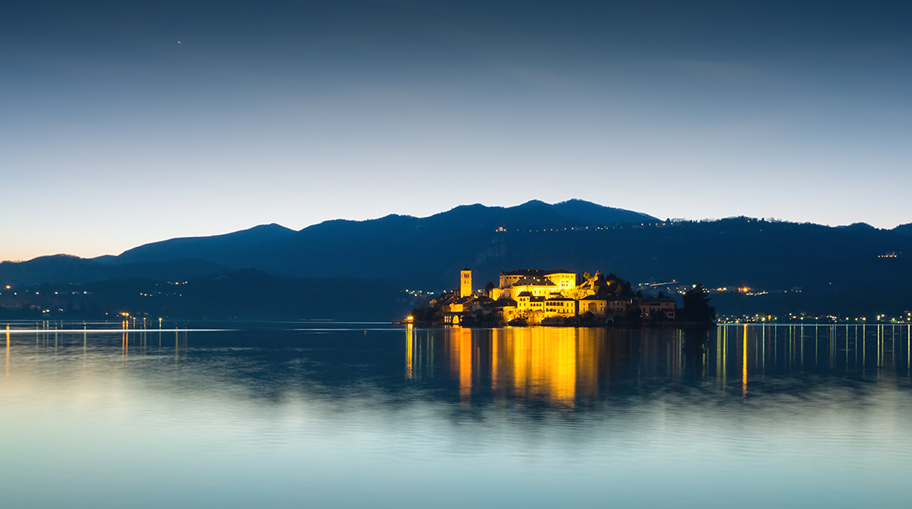 LAKE ORTA is perhaps the most beautiful of the Italian Lakes, its blue-green waters are surrounded by wooded hillsides and snow-capped peaks rise majestically in the distance. In the centre of Lake Orta is the Island of San Giulio. Legend has it that the island was infested with snakes and monsters, until the heroic St Giulio walked across the lake in a storm established a church and rid the island of its slithering hordes. Today there is just a handful of inhabitants on the island – most of whom are nuns living in a convent. The island hosts a poetry festival each summer.