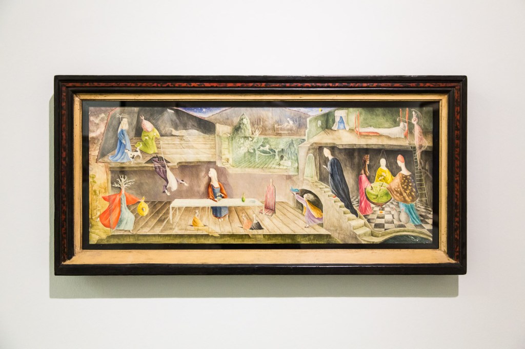 About the same time Leonora painted ‘The Old Maids’ a surreal tea party, where the ladies of the neighbourhood, wearing ridiculous hats, take tea. A bird pecks at the cake and a monkey dances around the edge of the table. A young girl serves the ‘maids’ whilst an angelic creation illuminates the room – whilst drinking tea! This confectionery of images is charming and appealing. The characters draw the viewer into the painting. Another young woman can be seen hurrying out of the house in the background.