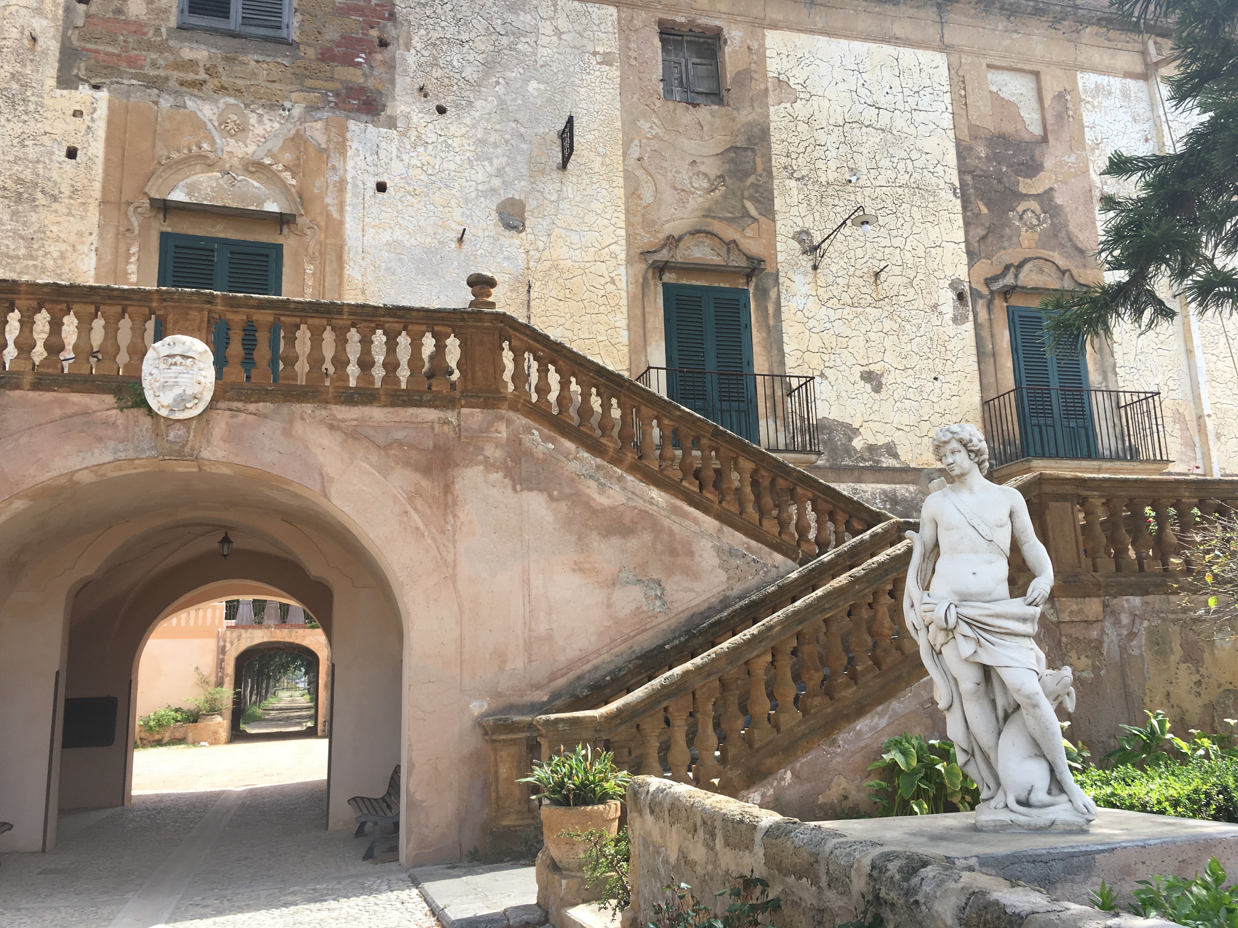 I stumble across the wooden floor, the light increases slightly and I approach the door. The handle is sticky, years of dirt and sweat have accumulated on the metal surface. I twist the door handle to the left, nothing happens, I twist again to the right, the handle lowers and I push the door open. Fresh air floods into the room and my eyes squint and narrow as I adjust to the early evening light. There’s a courtyard ahead of me and a beautiful outdoor terrace at my feet. I expect to see people, but there is not a soul. A solitary, scruffy cat meanders across the paving. The cicadas resume their repetitive chorus.