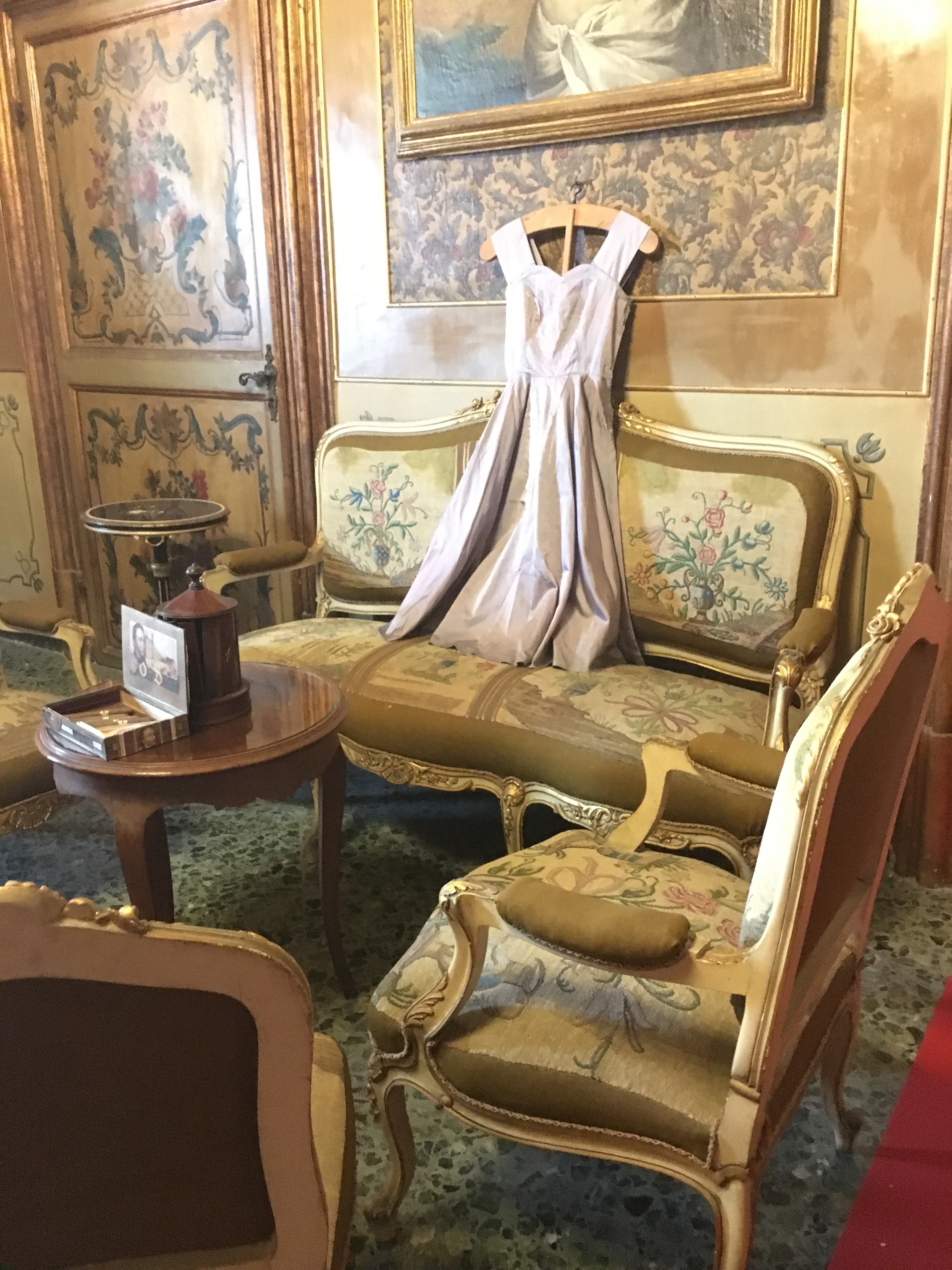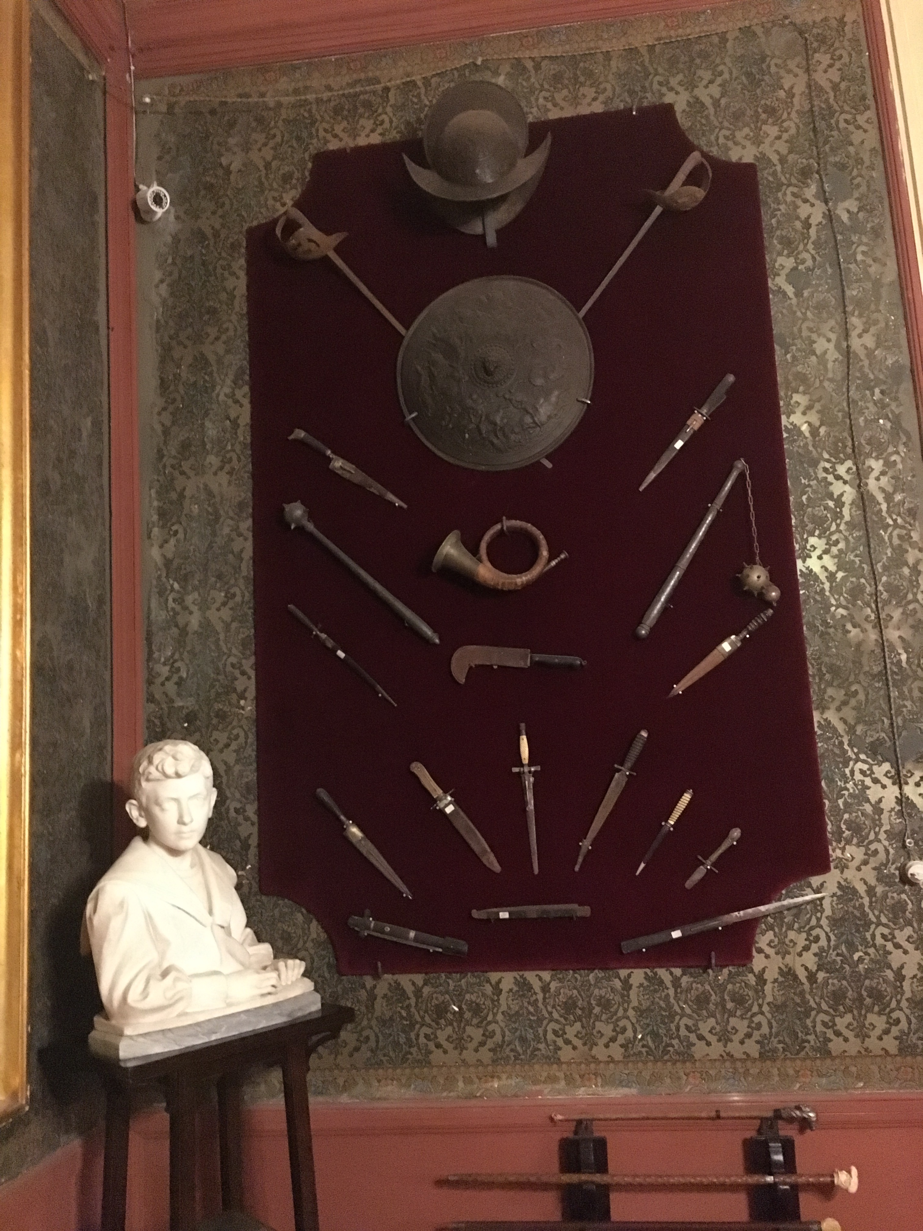The music and voices are fading, I advance into the next room. There are elaborate wall decorations, reminiscent of the art found in the Roman houses at Pompeii. The family crest, shields, weaponry, baskets of flowers symbolise power, strength and abundance. I’m becoming curious, who are the people that live in this house?