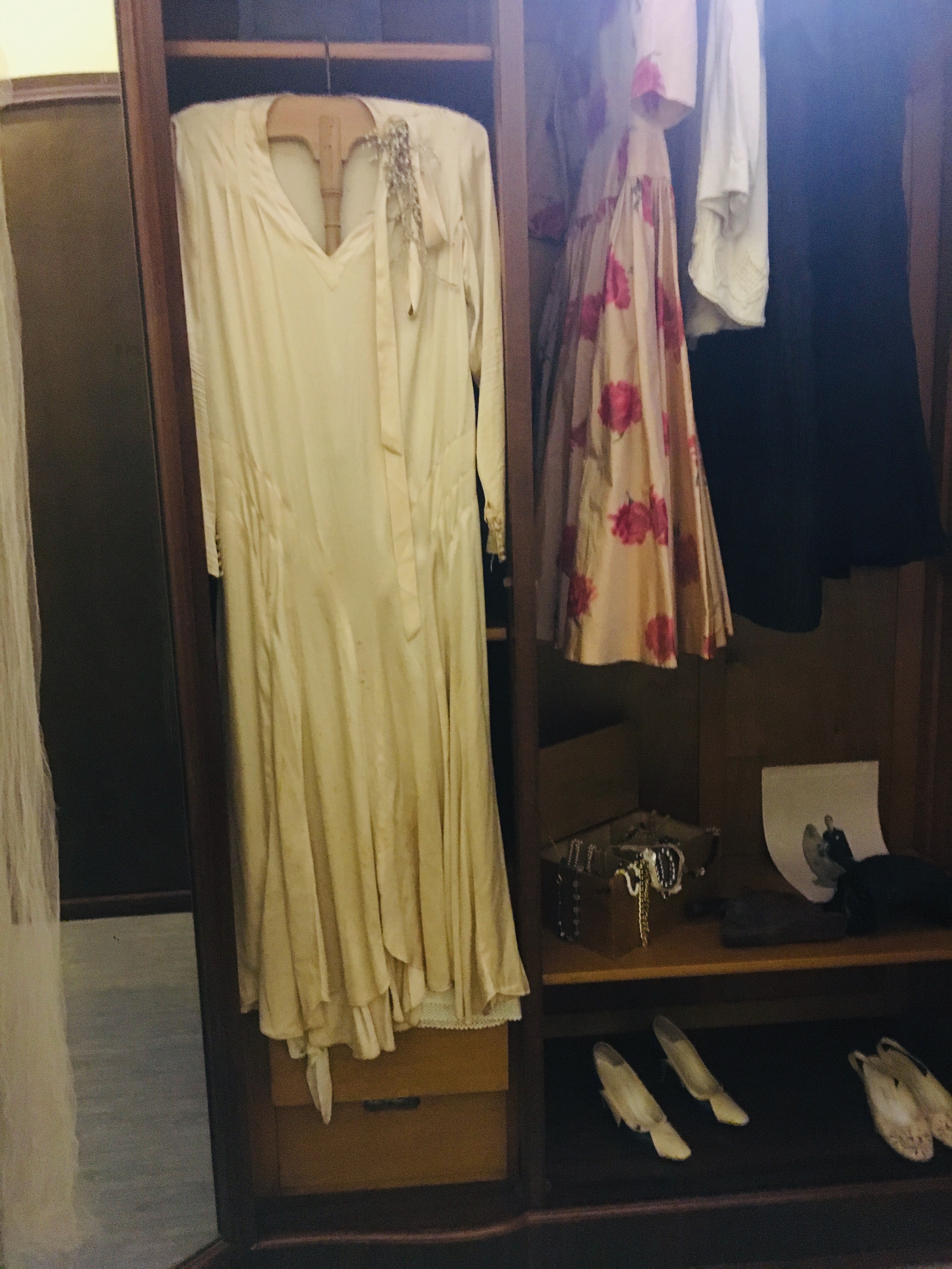 There’s a chink of light coming from under a door at the end of a gloomy corridor. I head for the light. Determined. There’s a 1920s bathroom on my left hand side, complete with a metal bathtub. Some ladies summer dresses, possibly pre-war are hanging, ready to be worn. But there’s no sign of any people. Suddenly the silence hits me, there are no sounds, the voices have stopped, the house is still. The atmosphere weighs down heavily on me, it’s like a millstone around my neck. I need to get to the door, open it and let the light in, I need to do this immediately.