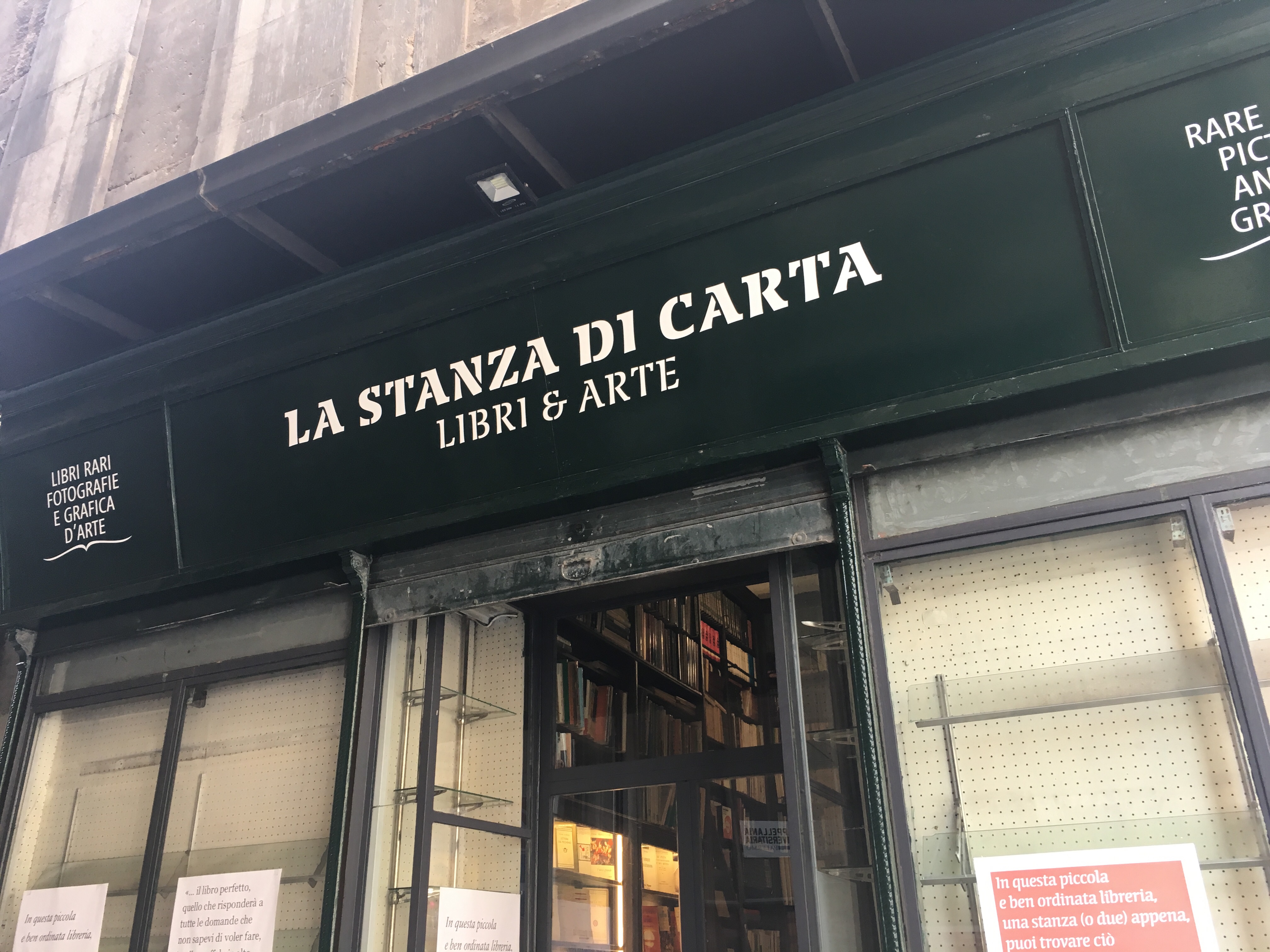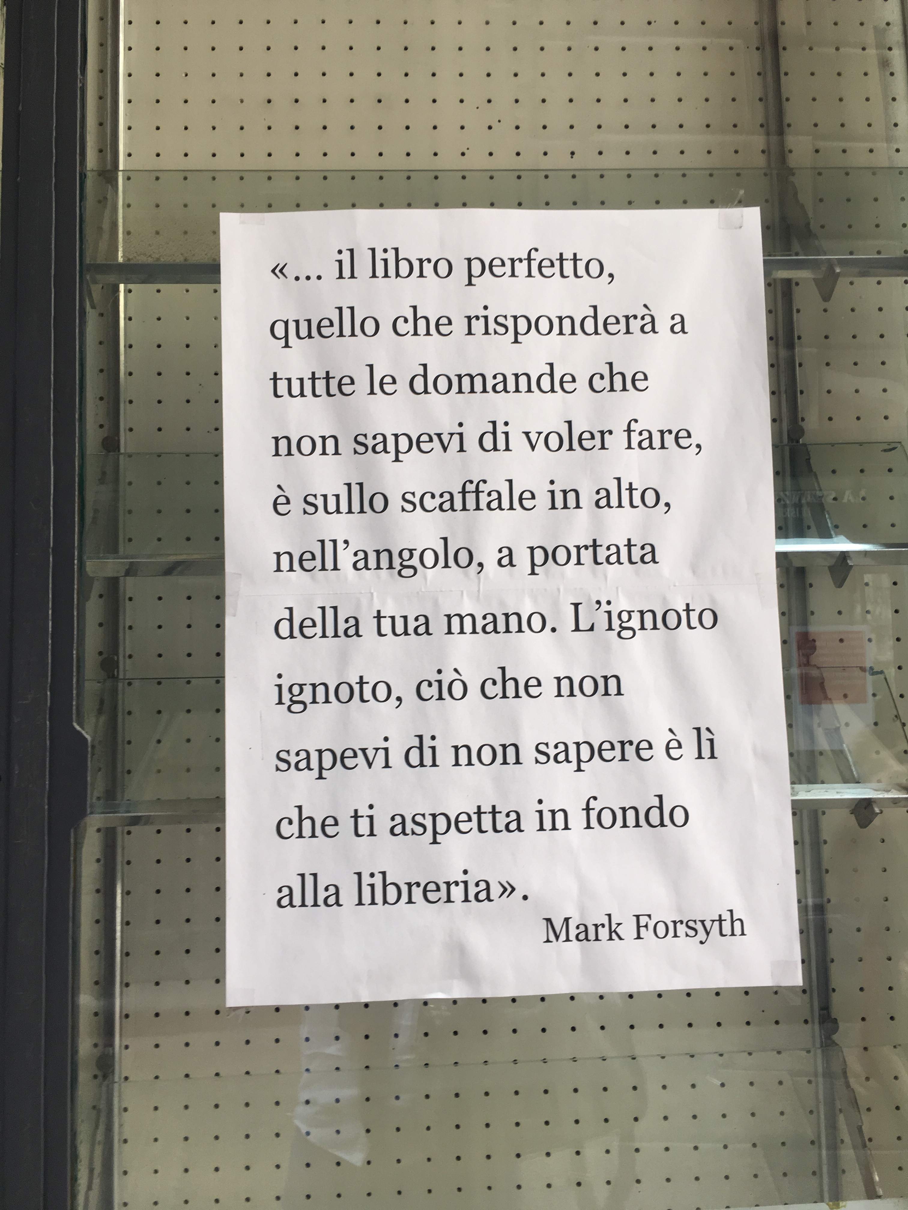THE STANZA DI CARTA is a rather small bookshop. It is very, very tiny indeed. Downstairs it probably measures about 10 feet by 10 feet, upstairs there’s a minuscule gallery which runs round the circumference of the shop at mezzanine level. It’s wide enough for a person to walk along, without moving sideways. There’s also a seating area, with two chairs and a bow window overlooking the street below. I spent ages looking at the windows of the shop, before going inside. Each window had been covered with sheets of A4 paper. Each piece of paper had a quote printed on it in large letters. I was busy translating these sentences in my head. One was a quotation by Mark Forsyth: