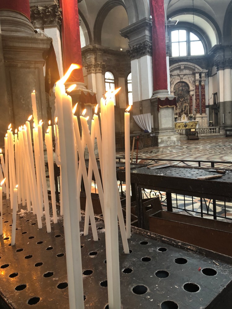 In the 1630s the plague was back again in Venice. It destroyed more than a third of the population. Once again the city leaders decided to build a church to celebrate Venice’s survival. This time it was the Basilica of Santa Maria della Salute, a Baroque masterpiece by Baldassare Longhena. Santa Maria della Salute means ‘St Mary of Good Health’ a very appropriate title for a religious festival that celebrates ‘salute’ or well-being. In November last year, I was present at the ‘Festa della Salute’ in Venice, along with most Venetians. It was only days after the high water flooding that had caused great damage to Venice and the islands of the lagoon. The church was filled with people; families, couples, children, pensioners, all bearing candles. The interior of the church was beautifully decorated with pink roses. The atmosphere was joyful and grateful – even though just days before, Venice had been inundated by water. I was overcome with respect and admiration for the Venetians; tough and resilient, clever and hard-working, kind and funny. If any group of people know how to deal with adversity then it is the Venetians.