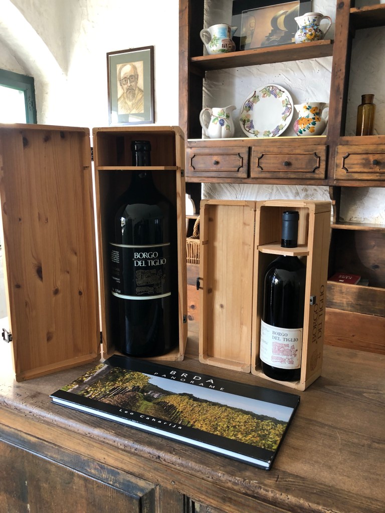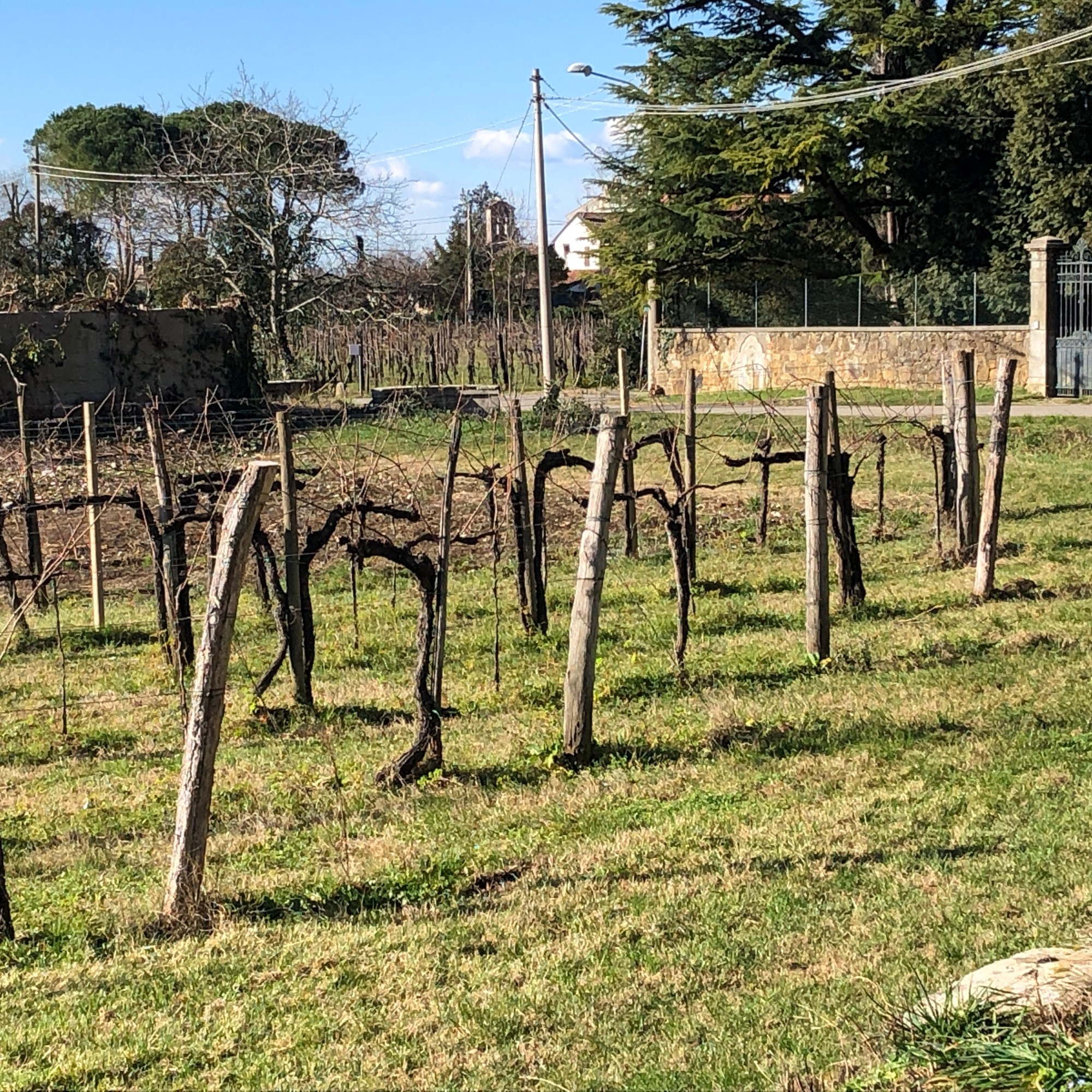 An archway embedded in the wall allowed me a glimpse of the terrain beyond – sloping uphill towards Slovenia. The land was manicured, rows upon rows of vines, all pruned and staked and ready for the new season’s growth. There was a young man tidying the vines. I stopped the car, stepped into the vineyard and wished him a good day. He asked me what I wanted and in a competent, but not very friendly manner asked me to follow him. He trotted off back down the lane on foot, I followed in the Mini. He directed me to park by the church and then beckoned for me to enter a village house with a shiny, brass plaque on the door. The sign said ‘Borgo del Tiglio’ which means Village or Hamlet of the Lime. This vineyard and it’s neighbours have been producing top quality white wines for the last twenty years. Rich, rounded wines to rival the very best Sauvignons of New Zealand.