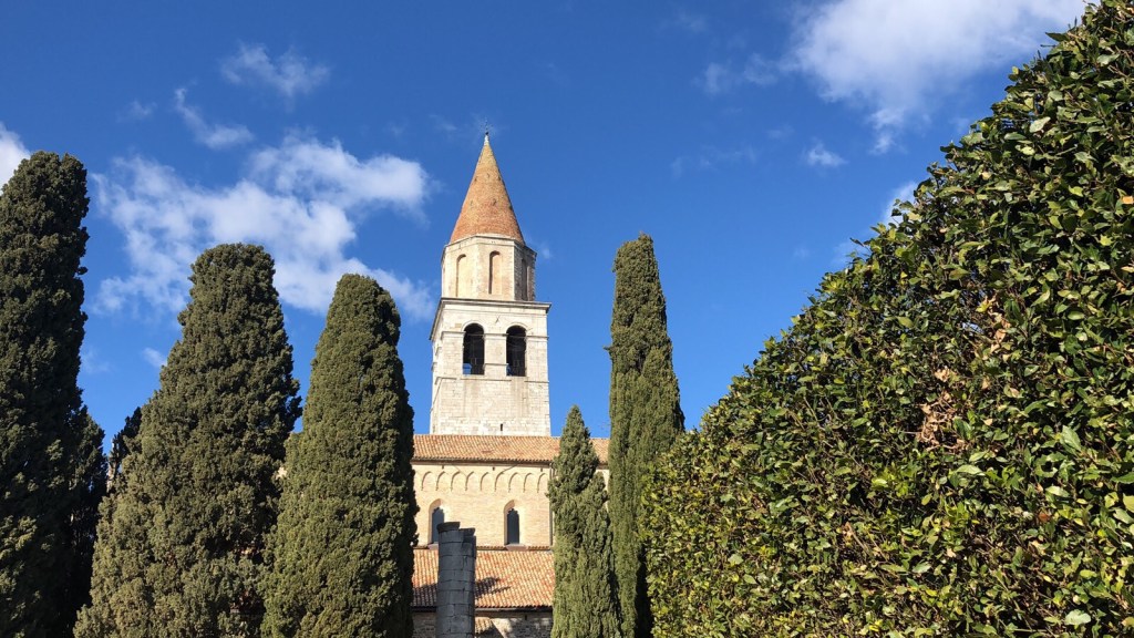 My next stop was Aquileia, an important Roman town two thousand years ago. I intended to stop at Cantina Ca’Tullio, a modern vineyard producing decent quality, every day wines ……I didn’t quite make it there, but I did have a delicious sandwich lunch over-looking the Basilica of Aquileia. After lunch a quick visit to see the Roman pavement mosaics underneath the medieval church was an essential cultural experience. These mosaics are quite exceptional. After all you can’t have a Mini adventure in Italy without food, wine and a bit of culture!