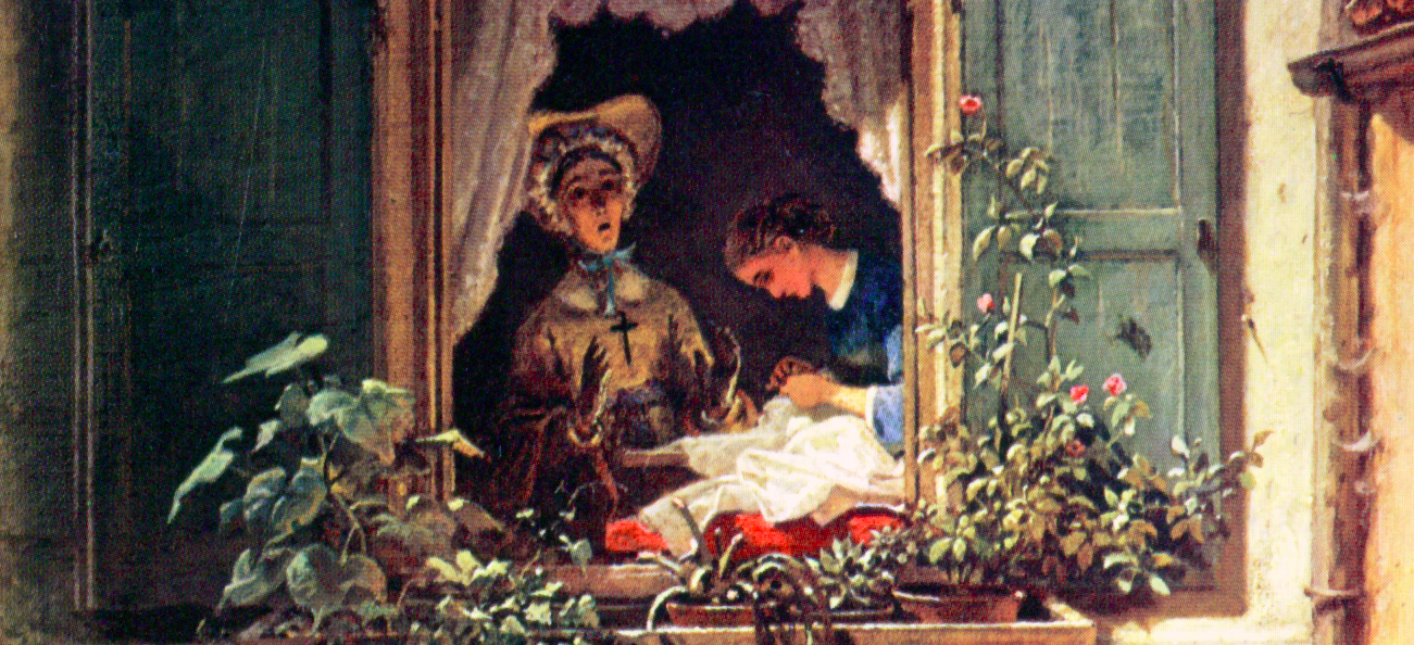 Having discovered the tone and capability of Spitzweg’s art I felt compelled to learn more about his work. The next painting to interest me was this elegy entitled ‘The Intercepted Love Letter’. A young man (probably a student because of his cap), is lowering a letter from his window to the window of a young woman who lives below. Unfortunately her lady’s maid or governess spots the piece of paper and her virtuous horror is clear for all to see. The older lady is wearing a large crucifix crudely identifying her as a woman of faith. Her open-mouthed astonishment is comical. The young lady is so engrossed in her needlework that she appears not to notice the letter hovering on the breeze. For good measure Spitzweg has added a couple of doves or pigeons, balanced on the gutter to the right of the love letter, a reference perhaps to courting couples……..