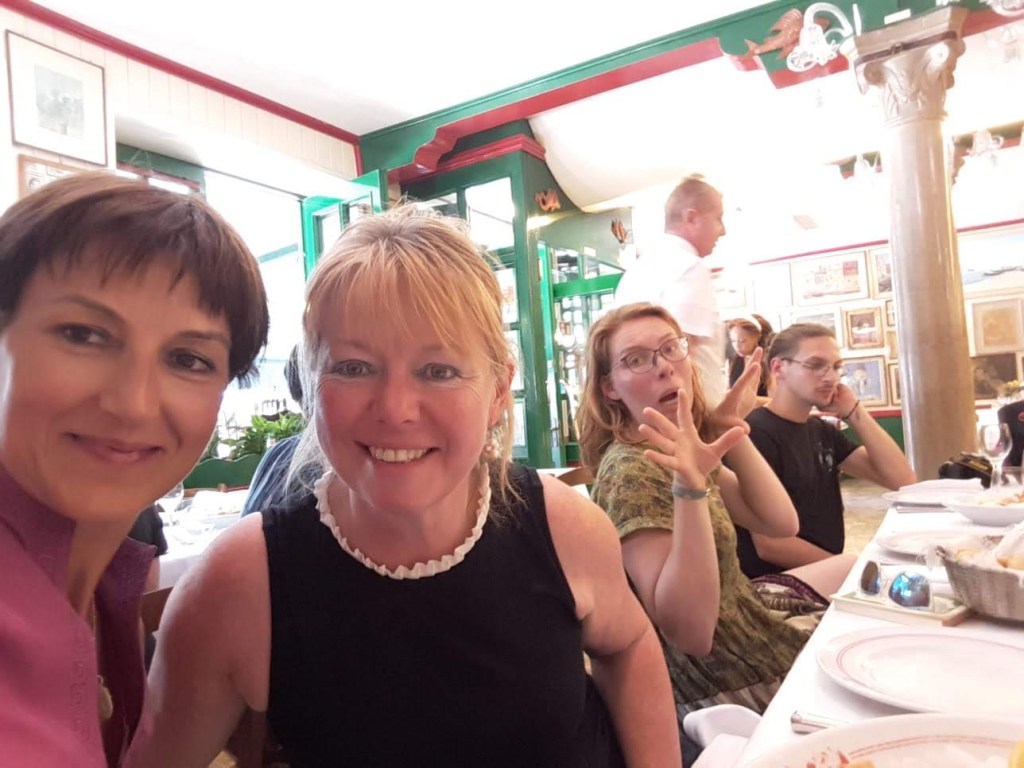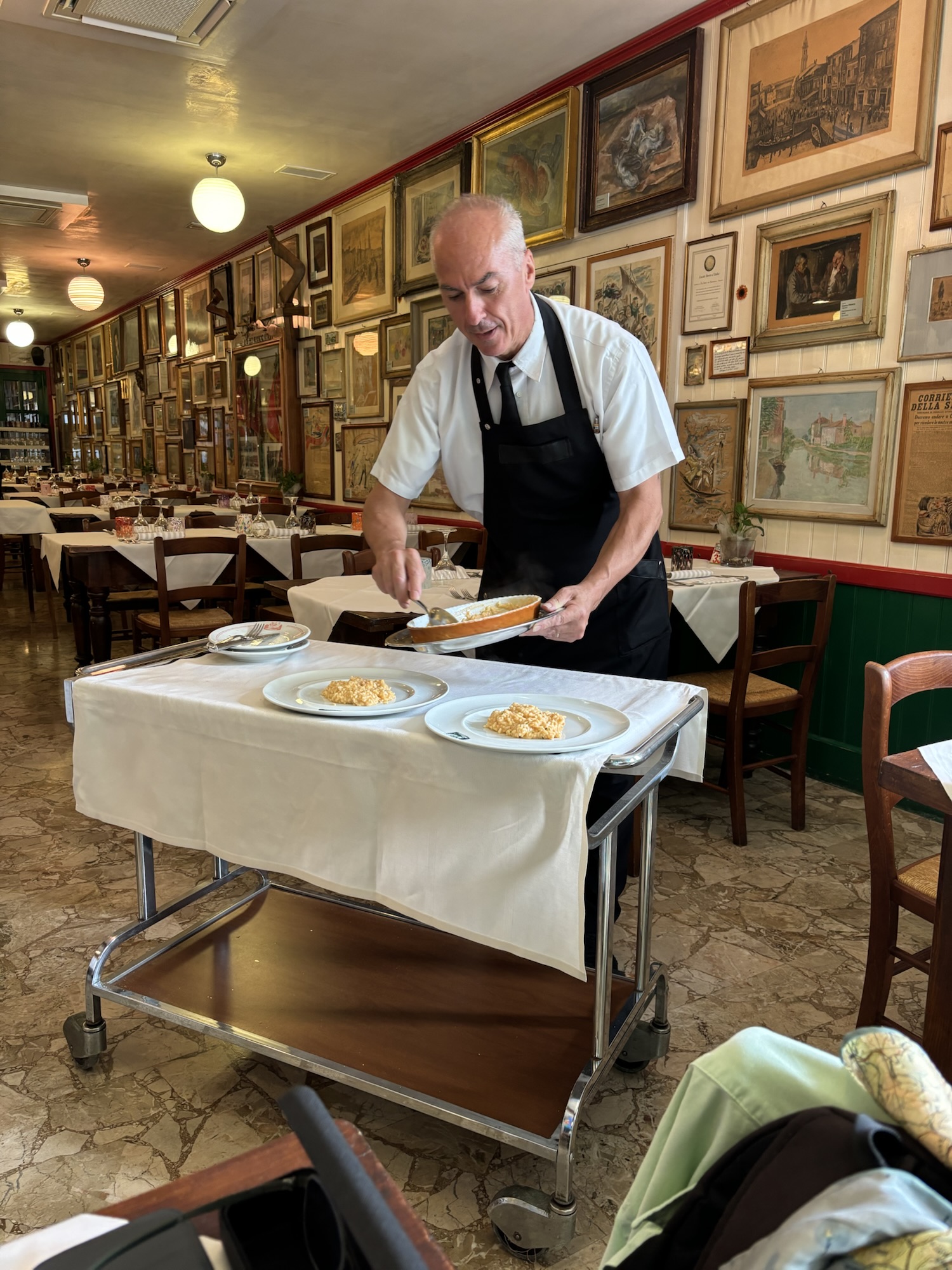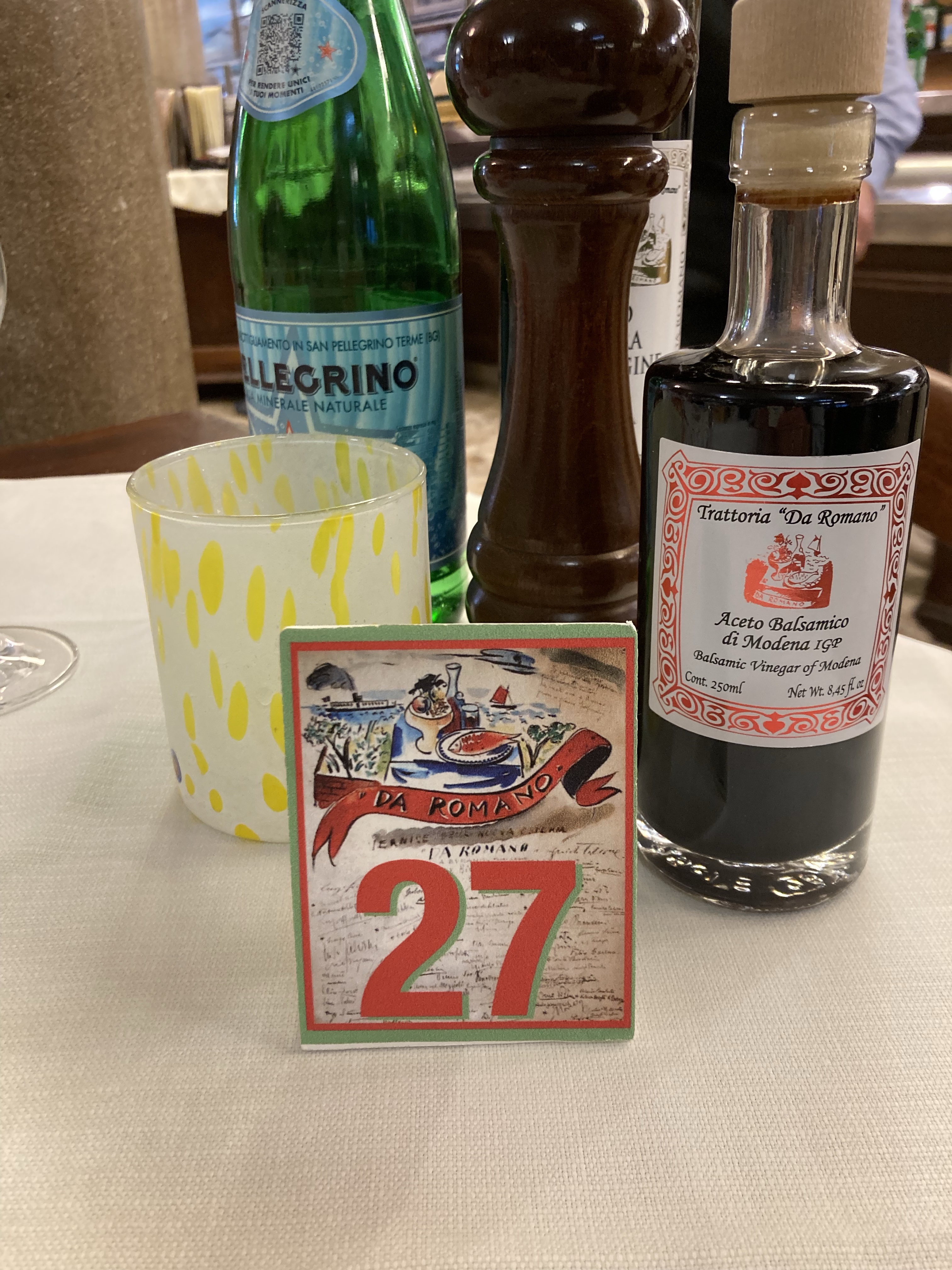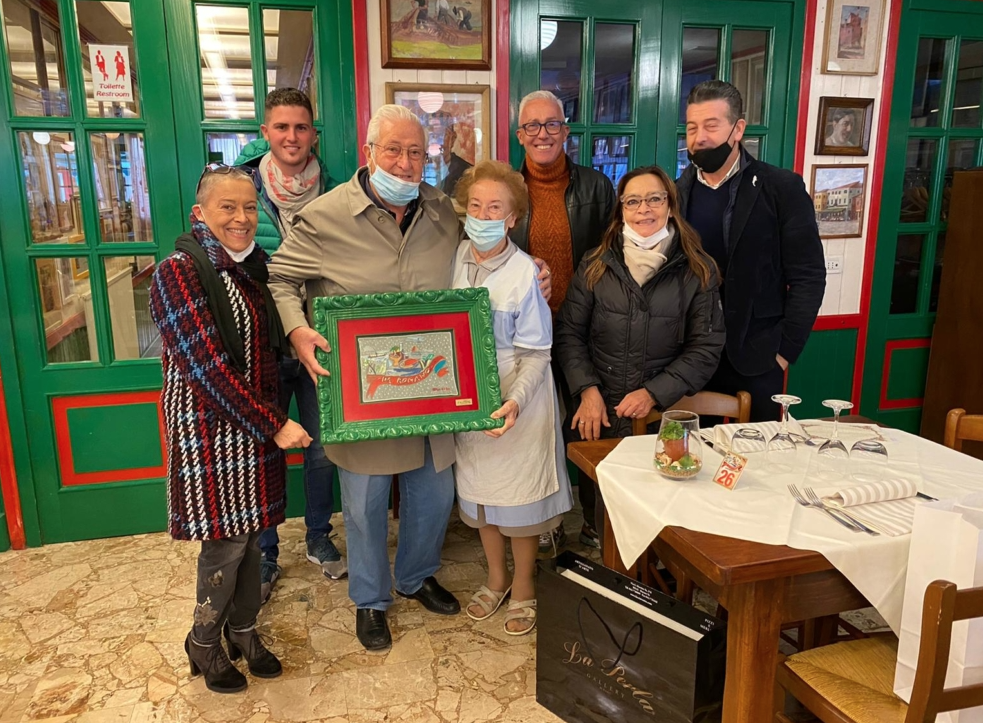 FRIENDS AND FAMILY – and it’s not just the food, it’s the atmosphere and ambience. I feel so welcome when I walk through the door. It’s like eating with friends. Over the years I’ve eaten here with my husband, with my children, with extended family groups, with nephews and nieces, with American friends and with valued clients. I don’t know how many people I’ve taken to ‘Da Romano’ over the years, but it’s many, I’m guessing at least one hundred. I’d love those guests to think back to their visit and to wish the family well. Linda will have been there, even if you may not have noticed, in the background, probably in the kitchen. I invite you to recall the flavours of the dishes placed in front of you, the quality of the food and the quality of the welcome. The speciality of the house ‘risotto’ comes in three variations; shrimp or prawn, squid ink or ‘go’ (the little fish unique to the Venetian lagoon). Typically the whole table has risotto and it is delivered to the table so that we can serve ourselves, family-style or of course, the waiters will serve you. Meanwhile the freshest of salads are displayed on an old-fashioned trolley where Signora Linda is quite likely to be found serving portions to diners, with a smile on her face and a kind word for all.