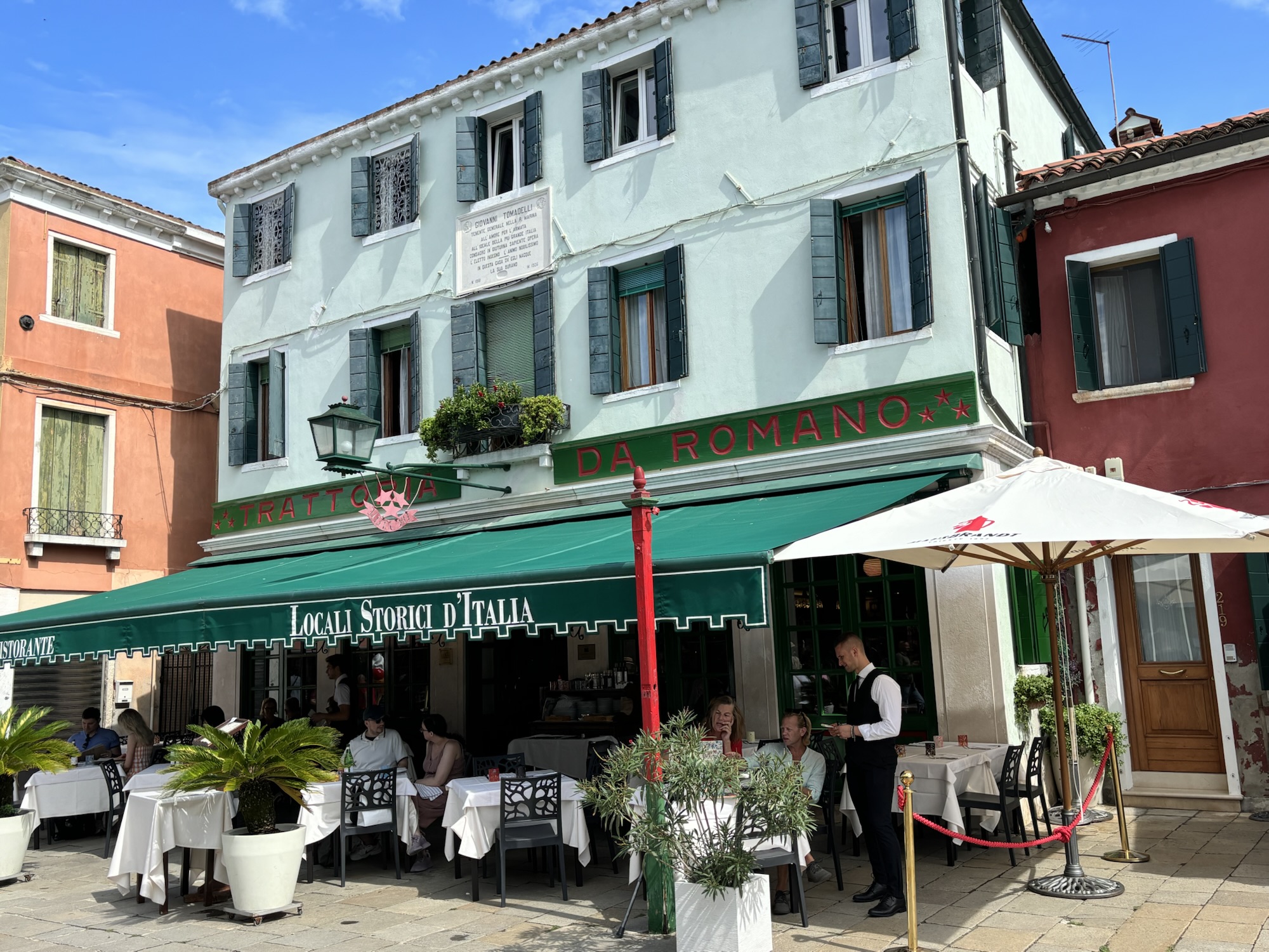 For the last thirty years a trip for me across the Venetian Lagoon has to include a visit to the island of Torcello for churches and mosaics, followed by a fabulous fish lunch at ‘Da Romano’ on the fishermen’s island of Burano. This is the perfect way of exploring the vast, natural wetlands of the Venetian lagoon. The combination of a boat trip, fresh air, wonderful panoramas and breath-taking natural beauty is true nourishment for the soul. In fact such a trip is necessary, vital even, at least once a year. I’ve written numerous articles about the lagoon of Venice and the island of Torcello. You might enjoy reading Torcello – Island of legends where I discuss Locanda Cipriani and Ernest Hemingway. But this article is about the island of Burano and the very special family-run trattoria ‘Da Romano’ which has been offering delicious fresh fish to locals and visitors for more than a century.