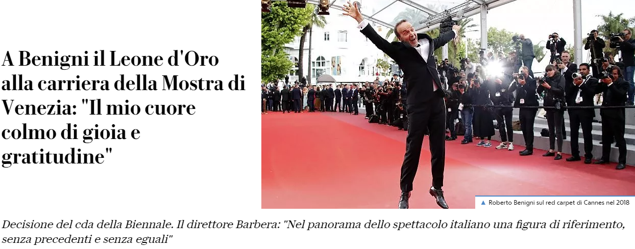 The truth of the matter was that I’d found ‘La Vita e Bella‘ such a wonderful film, but also such a tragic film, that I couldn’t bring myself to remember and write about Guido and his ordeal. I kept finding another subject to write about or another film. Then about a week ago whilst reading www.repubblica.it one of Italy’s best newspapers I came across an article reporting that Roberto Benigni was going to be honoured with a Lifetime Award for his contribution to cinema at this year’s Venice Film Festival. I realised that the time had come to write about ‘La Vita e Bella’ and Benigni’s extraordinary genius.
