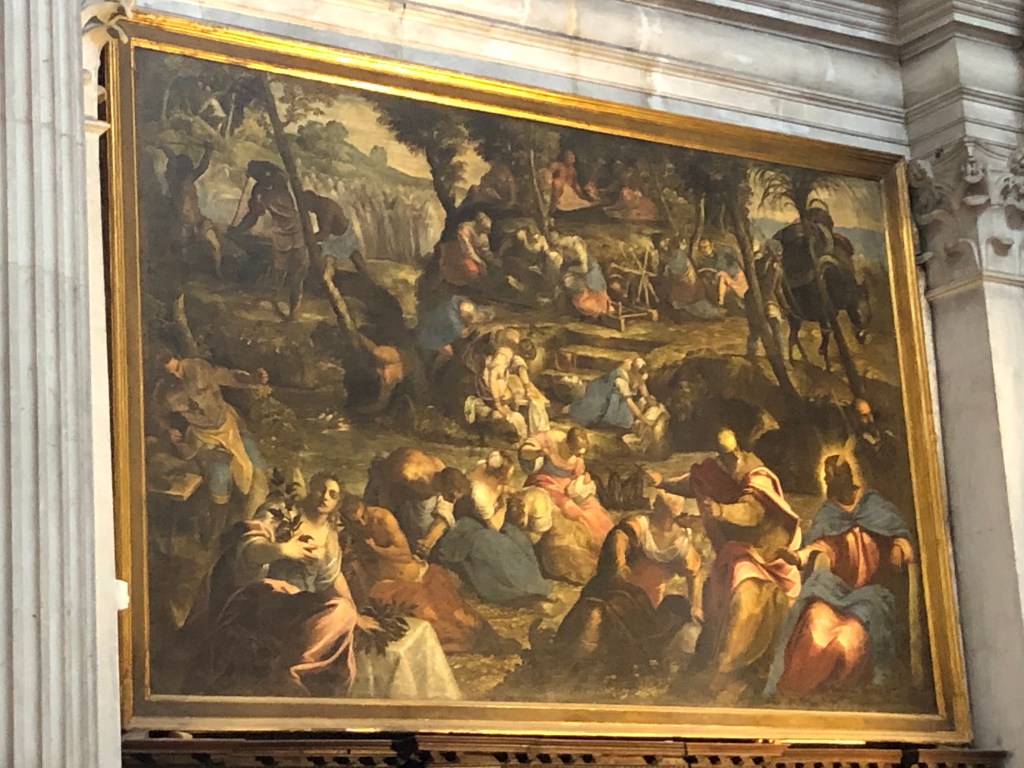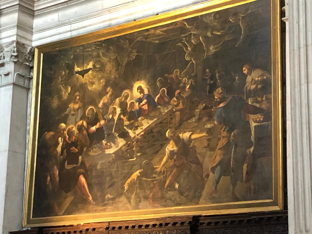 BACK in the 16th century the Benedictines commissioned two huge paintings by painter Tintoretto. They hang on either side of the altar. Painted in the 1590s these paintings have been displayed in the church for more than five hundred years. On the left is ‘Manna from Heaven’ a bible story showing food (manna) raining down on people as they faced starvation. On the right is Tintoretto’s version of ‘The Last Supper’. This ‘Last Supper’ is actually quite bawdy in comparison to other ‘Last Supper’ paintings. The table is set off to the left and there’s all manner of chaos going on in the foreground – typically Venetian.