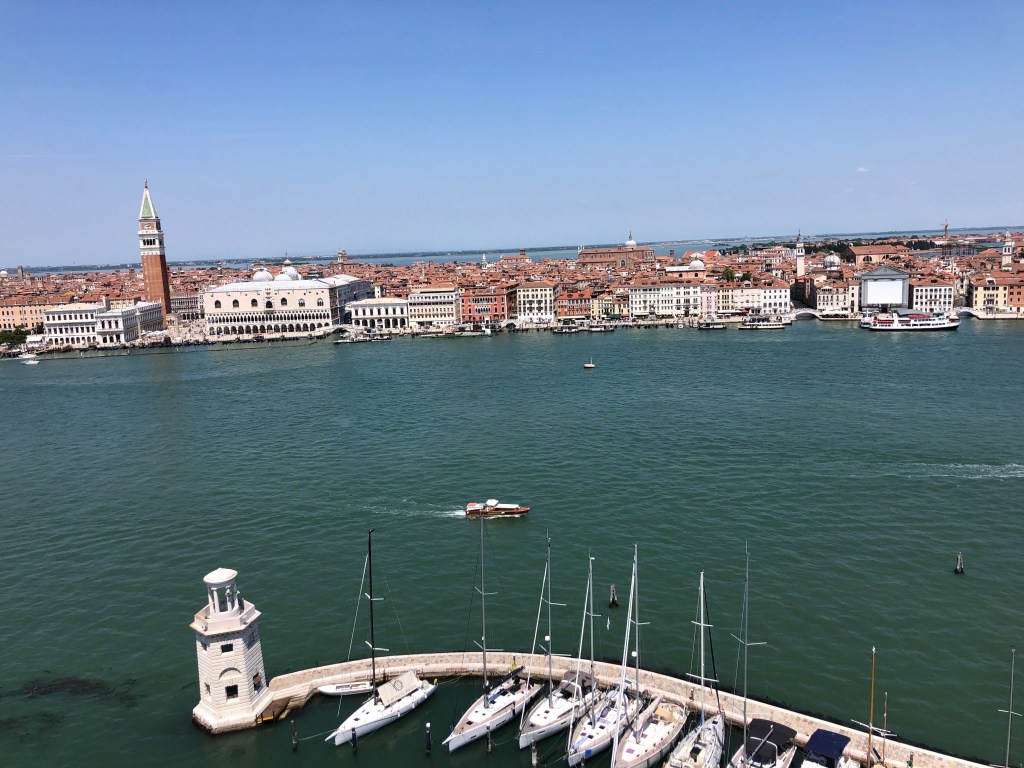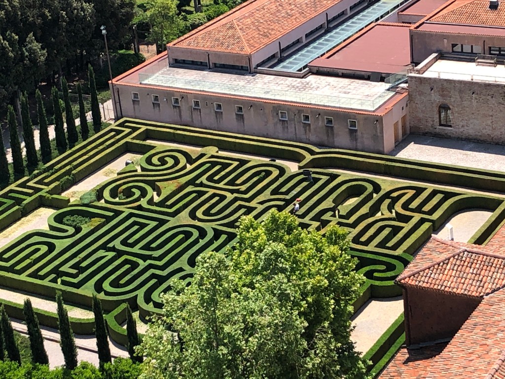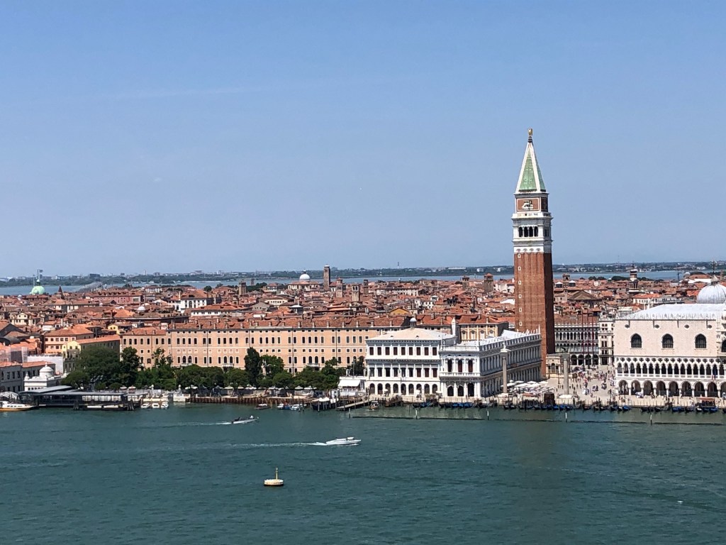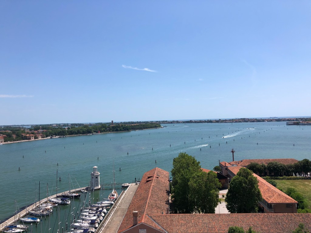 ON HIGH – From the top of the bell tower there’s a 360 degree panoramic view of Venice and the lagoon. It’s a wonderful observation point and perfect for understanding the layout of the city, islands, waterways and Adriatic Sea. It is possible to take photos from north, south, east and west. I often spend ages up there moving from side to side of the bell tower, appreciating and absorbing the view from each compass point. I like to imagine the sailing ships of days gone by, coming into the lagoon and anchoring in the Bacino San Marco, waiting to unload their cargoes of silks and damasks, precious stones and spices. Here’s a selection of photos I took just last week. As a viewing point over Venice it is unbeatable. You can even spot the Labyrinth in the gardens behind the basilica, recently opened to the public after being closed for many years.