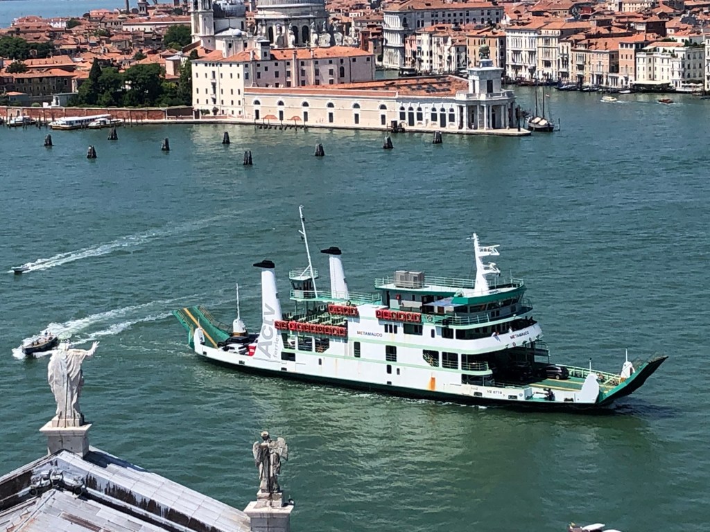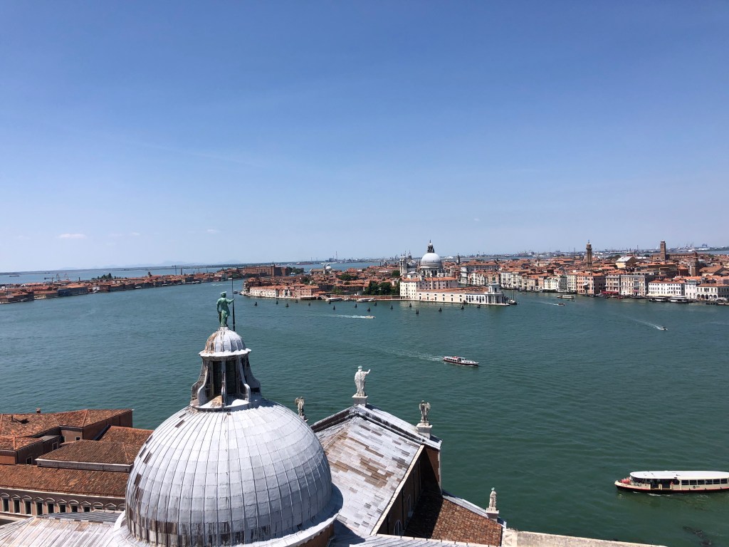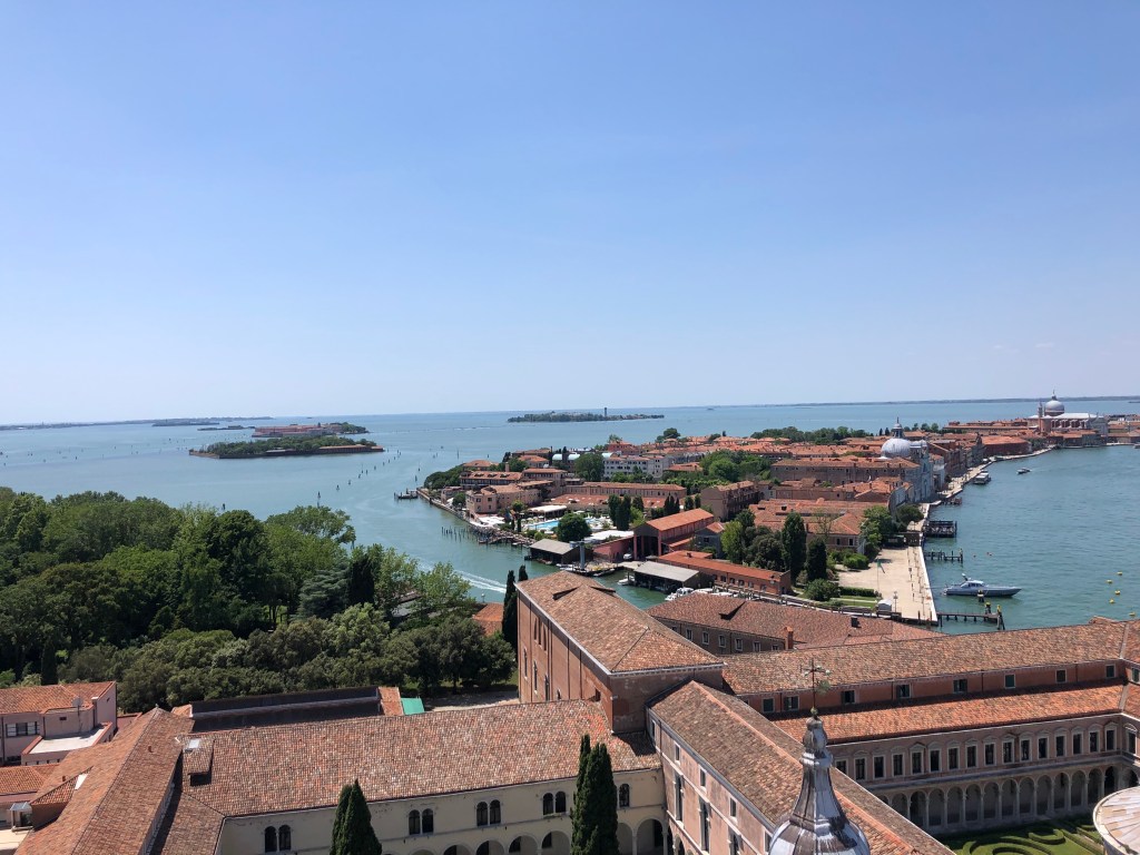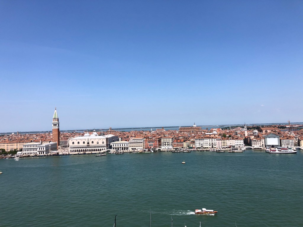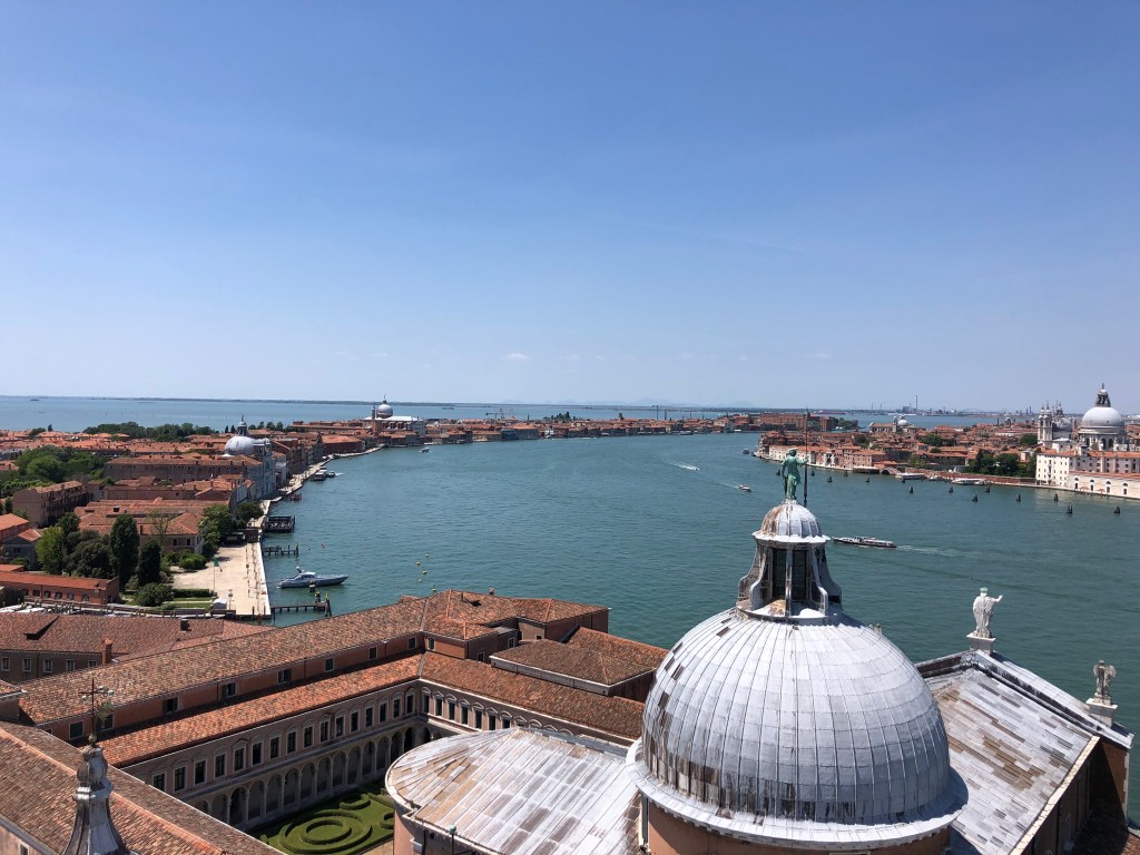 ON HIGH – From the top of the bell tower there’s a 360 degree panoramic view of Venice and the lagoon. It’s a wonderful observation point and perfect for understanding the layout of the city, islands, waterways and Adriatic Sea. It is possible to take photos from north, south, east and west. I often spend ages up there moving from side to side of the bell tower, appreciating and absorbing the view from each compass point. I like to imagine the sailing ships of days gone by, coming into the lagoon and anchoring in the Bacino San Marco, waiting to unload their cargoes of silks and damasks, precious stones and spices. Here’s a selection of photos I took just last week. As a viewing point over Venice it is unbeatable. You can even spot the Labyrinth in the gardens behind the basilica, recently opened to the public after being closed for many years.