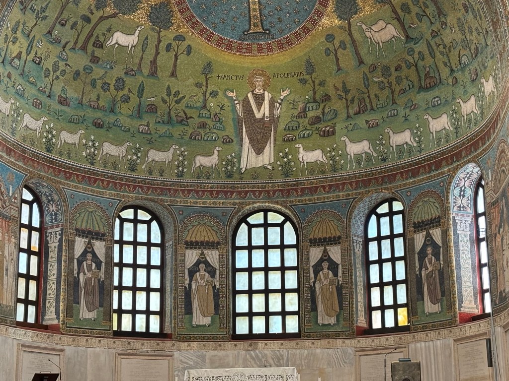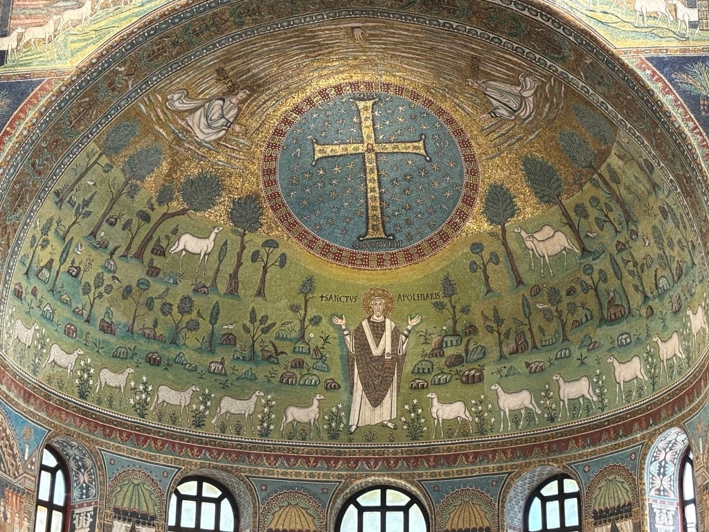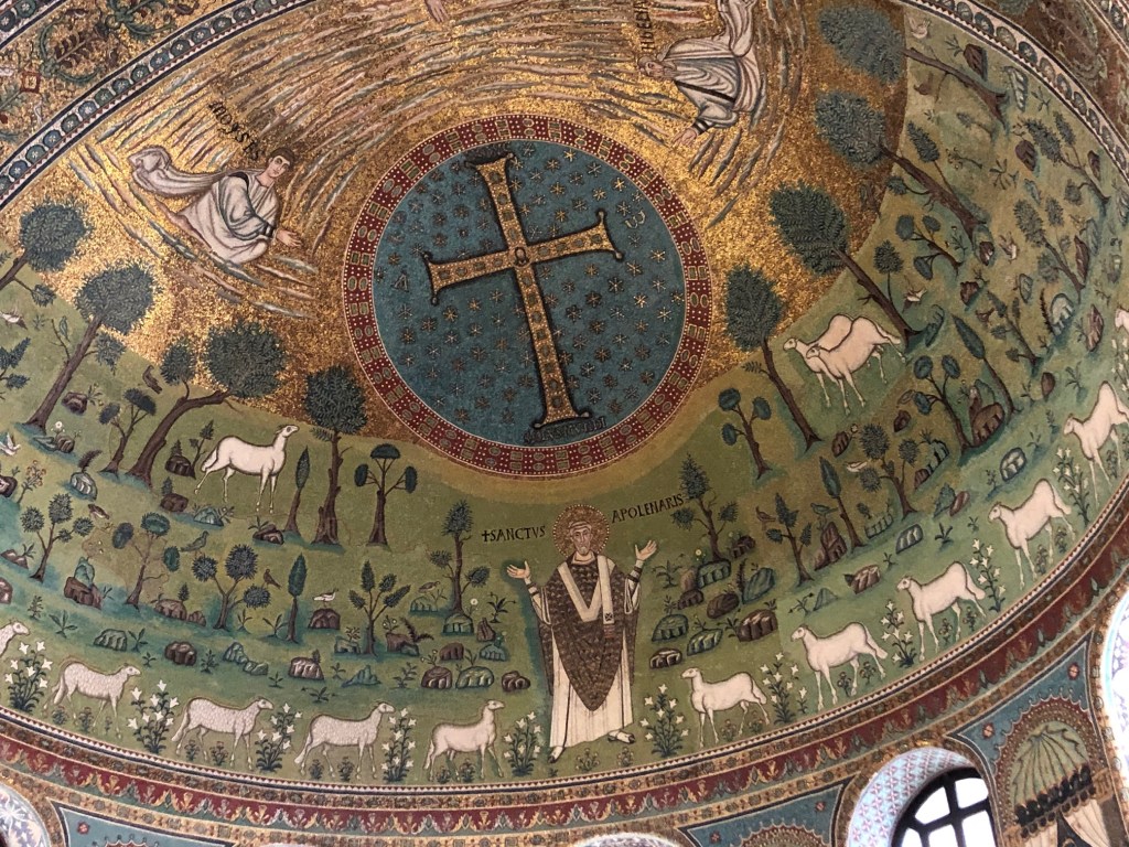 According to the Roman Catholic Church Apollinare was originally from Antioch an important Roman town in the Eastern Mediterranean (modern day Syria). However there is no written historical evidence to tell us where he was from and indeed no record of when he was born or even when he died. So much of his story is a mystery which was augmented and expanded after his death. The only part of Apollinare’s story that seems probable is that he was Bishop of Ravenna for 26 years – around 180 AD. When he died for his faith, in a field just outside Ravenna, his position as a Christian saint and martyr was secured forever. The road to ‘saintdom’ in the Roman Catholic Church usually takes a century or two to achieve. In the case of Sant’ Apollinare it was 549 AD (at least three hundred years after his death) when the Basilica of Sant’ Apollinare in Classe was built to commemorate and honour his name.