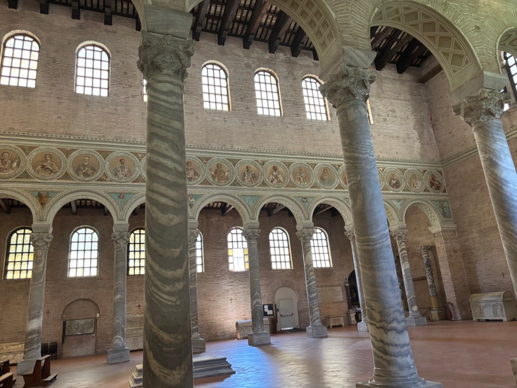Sant’ Apollinare in Classe is a wonderful basilica with an imposing bell tower. The church tower is a dominant landmark that is visible for miles across lush, green pastureland. The basilica was consecrated in the 6th century AD. It was dedicated to Sant’ Apollinare who was the first Bishop of Ravenna, and one of the early Christian martyrs who died for his faith.
