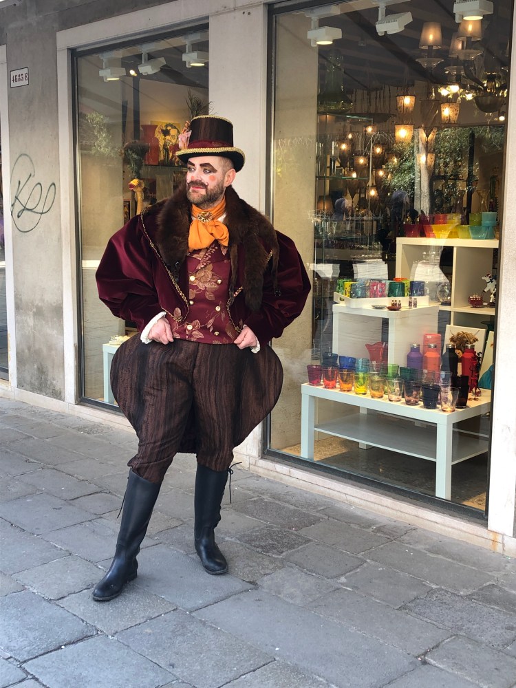 CARNEVALE – It’s Carnevale in Venice and the streets are filled with crazy costumes and parading characters. Carnevale literally means ‘carne’ meat and ‘vale’ farewell ‘goodbye to meat’ in other words. It is a reference to the fasting period that takes place in the 40 days leading up to Easter in the Christian calendar. Traditionally it is a time for parties and festivities in preparation for the serious days of penitence that lie ahead in the season of Lent. To say that the city of Venice is illuminated by fabulous costumes, elaborate gowns and tailoring of the finest sartorial quality would be an understatement. I was seriously impressed by the skill and creativity around every corner.