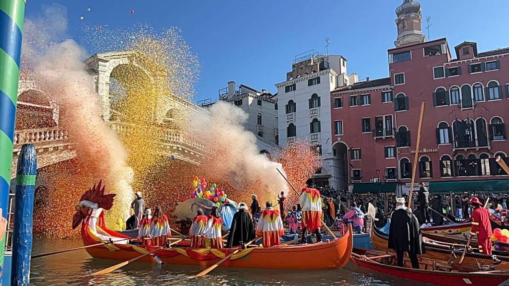 29th January, 2024 – The Venice Carnival is early this year. Festivities started officially yesterday with the Regata of Pantegana. This is a huge procession down the Grand Canal of traditional Venetian boats, accompanied by a giant papier mache rat! The so called ‘pantegana’ explodes next to the Rialto Bridge unleashing a cloud of balloons, confetti and plumes of coloured smoke into the air…. The ‘pantegana’ event marks the start of two weeks of celebrations leading up to Shrove Tuesday and the start of Lent.