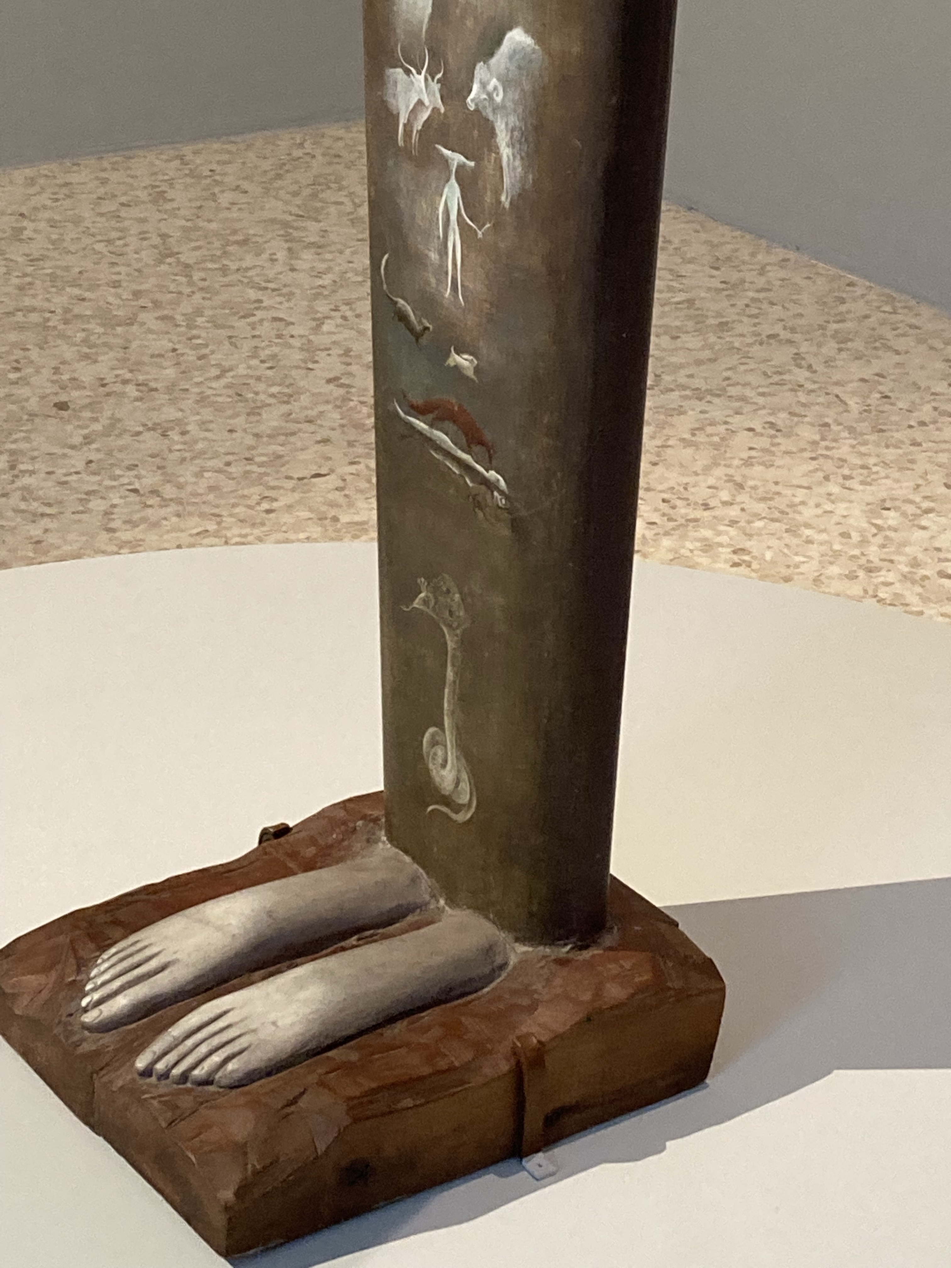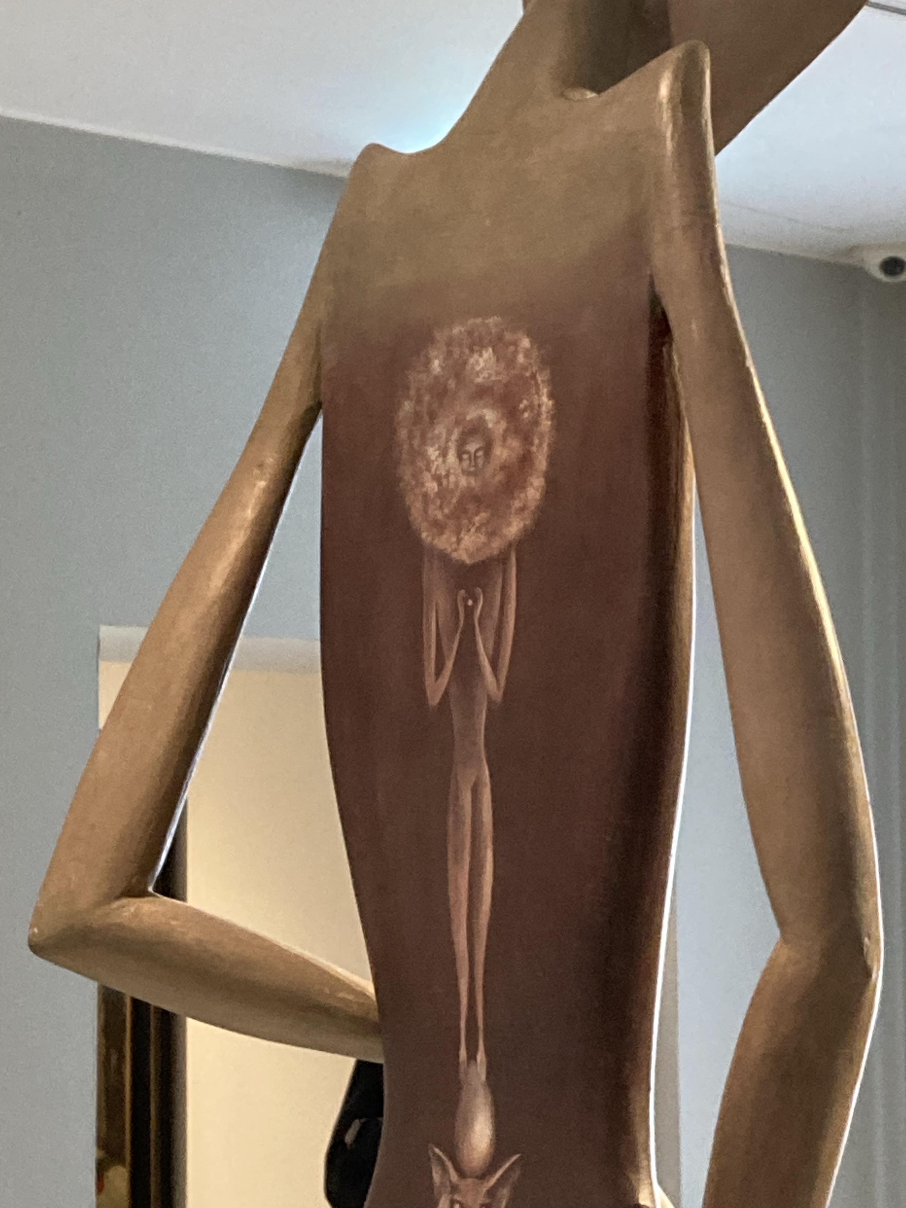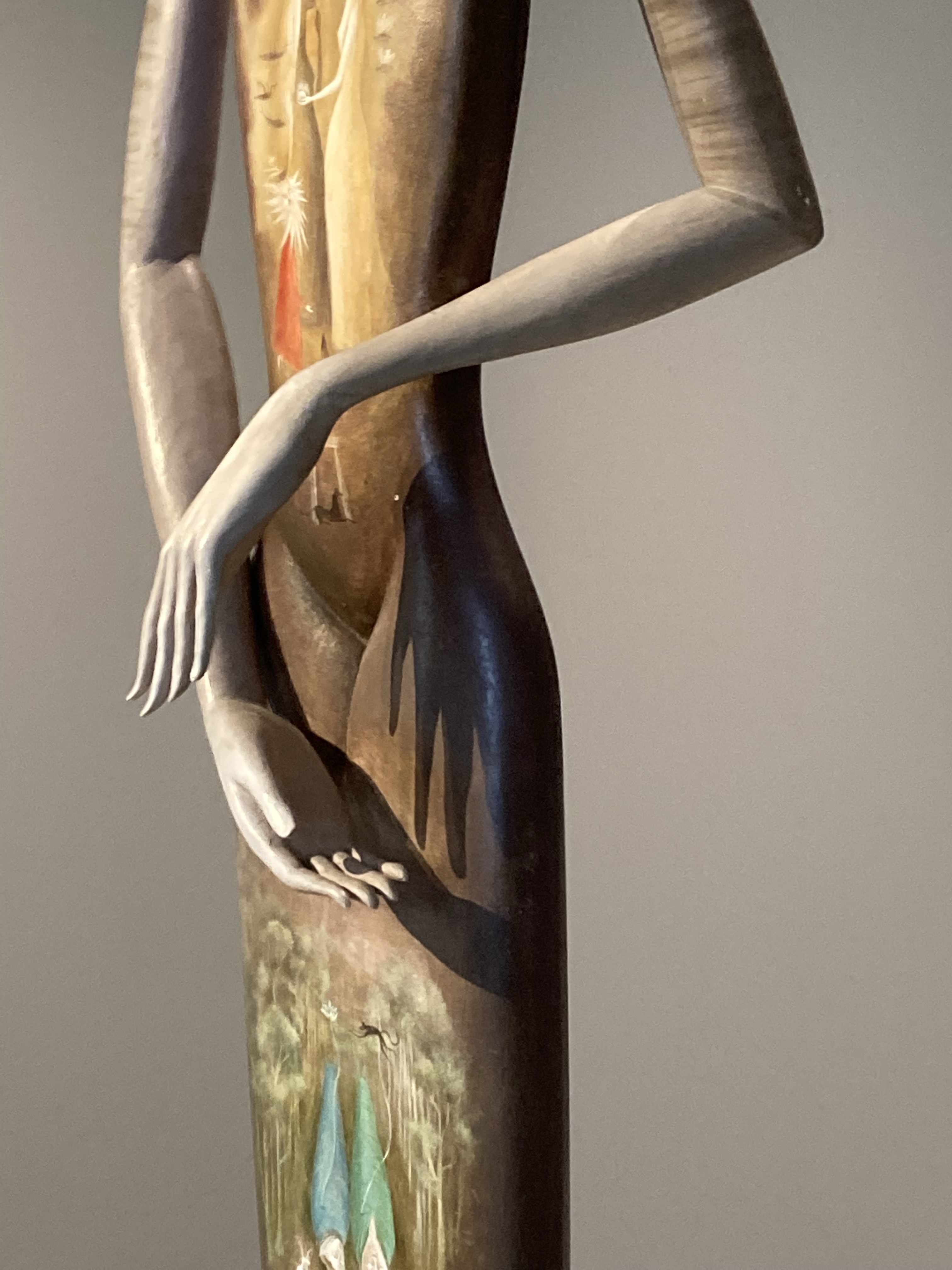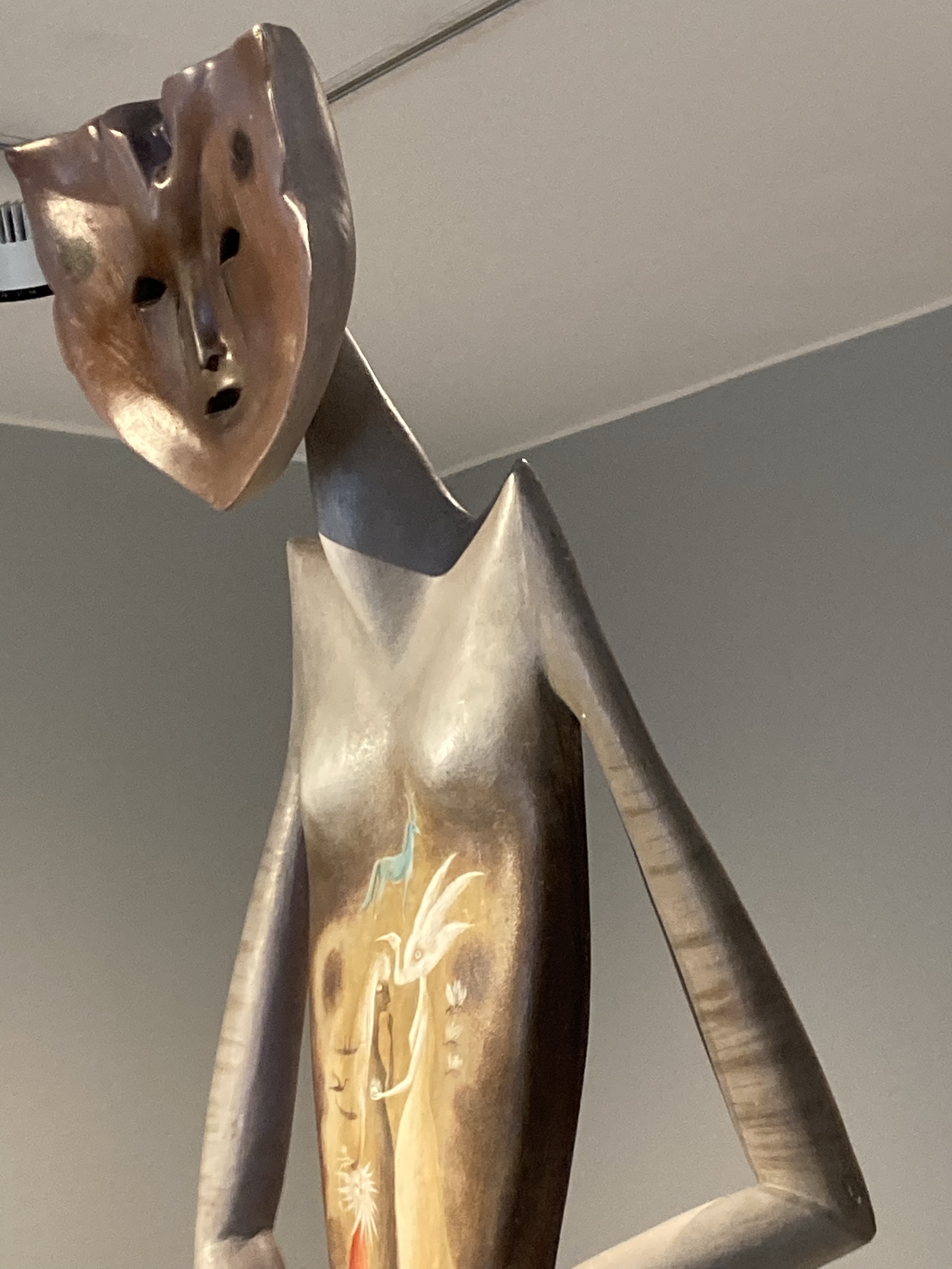 I’m a great fan of Leonora Carrington and I have been since The Tate Liverpool put on a big exhibition of her work in 2015. For me the ‘Surrealism and Magic’ exhibition at The Guggenheim is infused with Carrington from start to finish. Firstly there are several works by Max Ernst, who was Carrington’s lover and mentor in the 1930s. Next there’s the spectacular ‘Cat Woman’ sculpture that dominates a single room, dwarfing all else. This sculpture is detailed and compelling. The facial expression of the ‘Cat Woman’ evokes sadness. I want to listen to what she has to say. Her body is decorated with complicated fertility symbols, strange god-like faces and even a pair of peacocks, resplendent in their plummage.