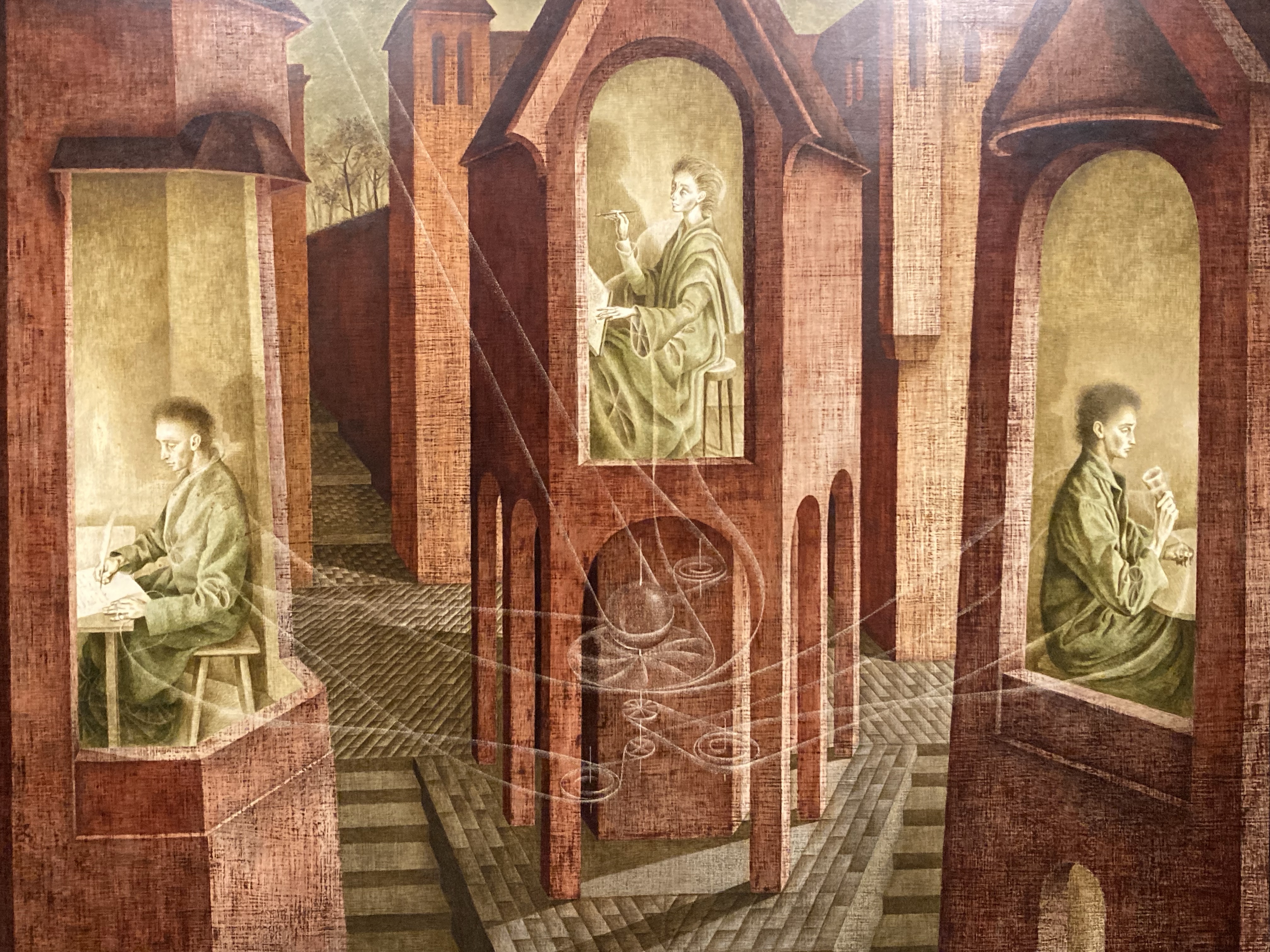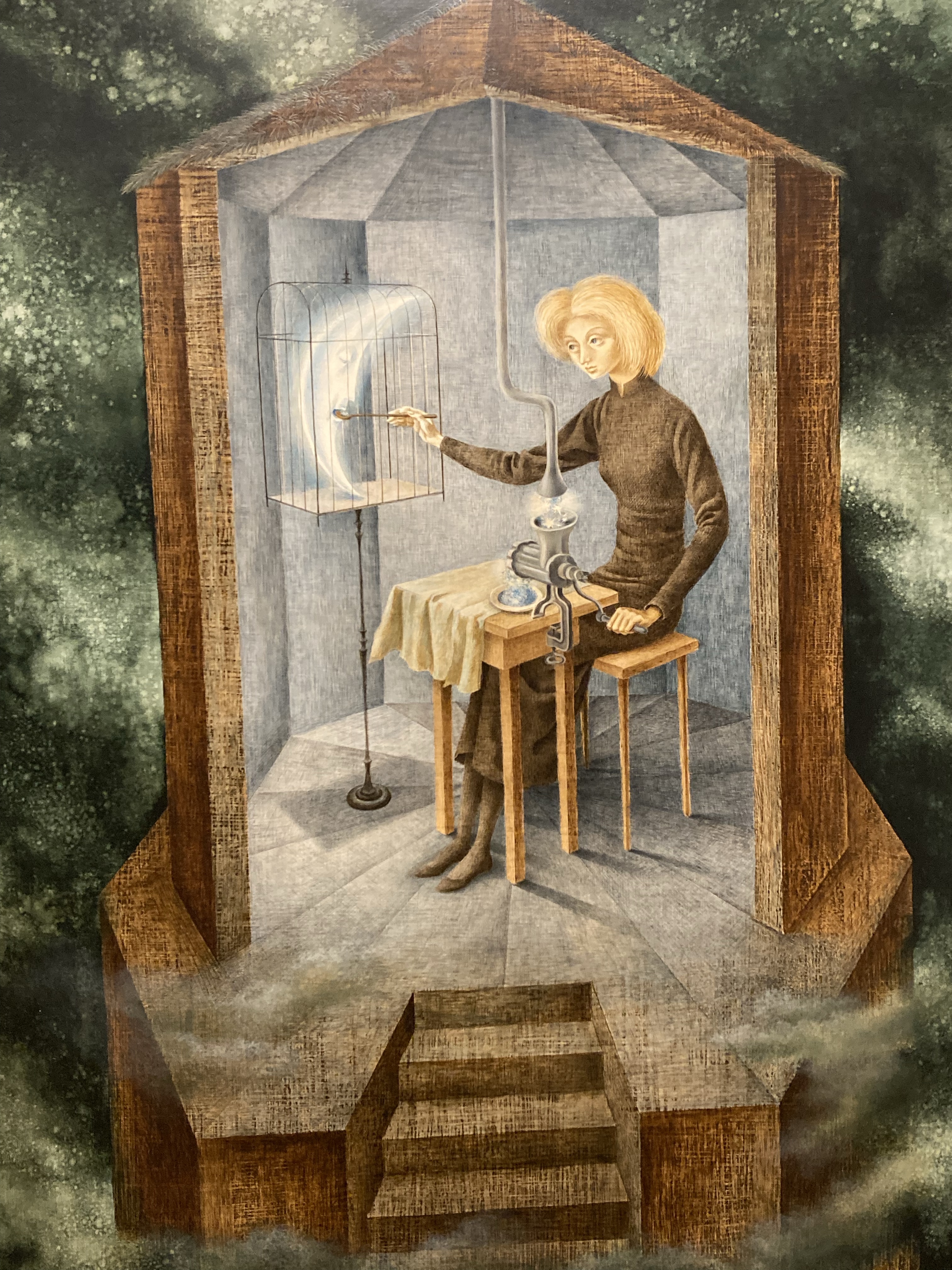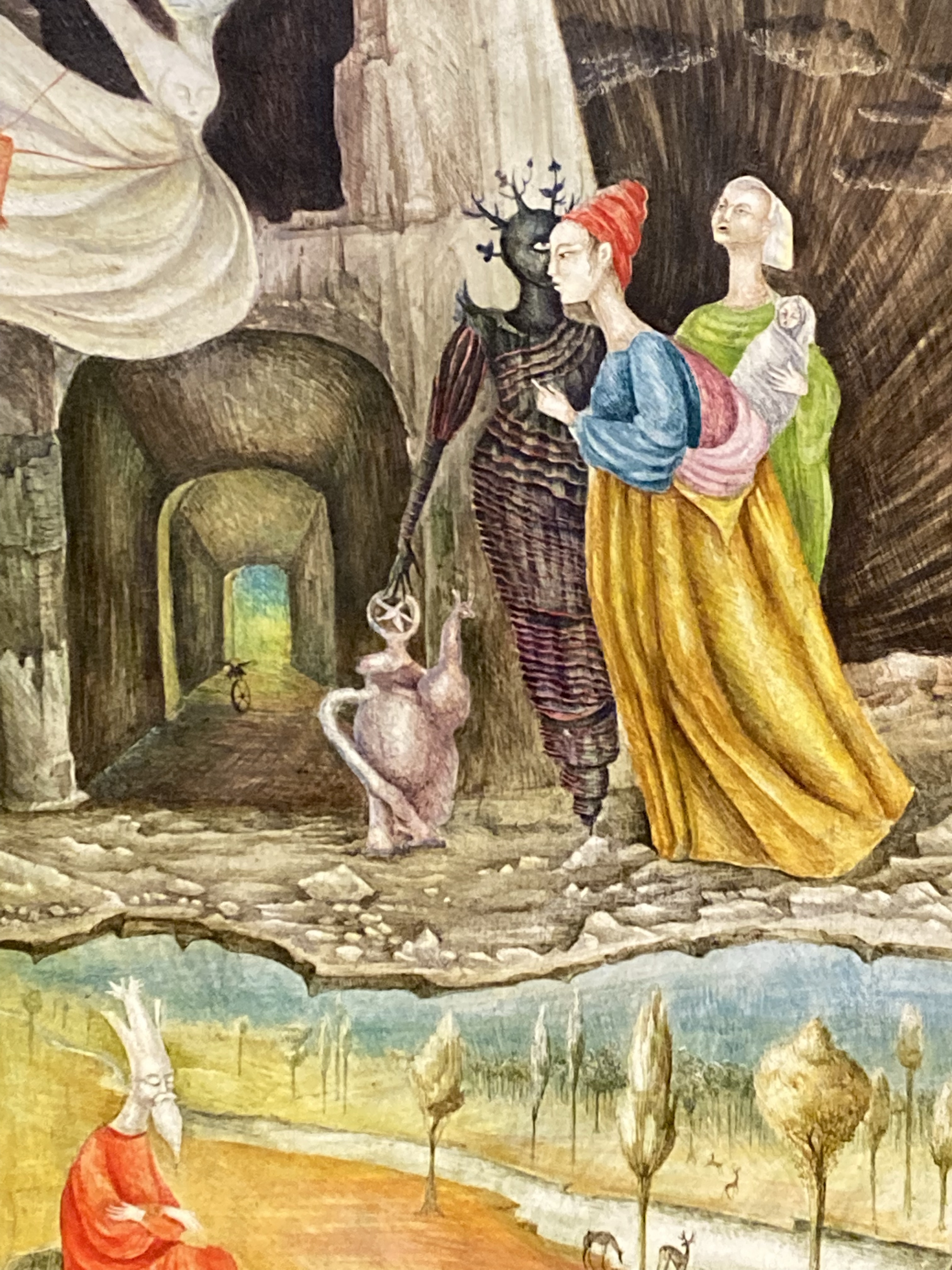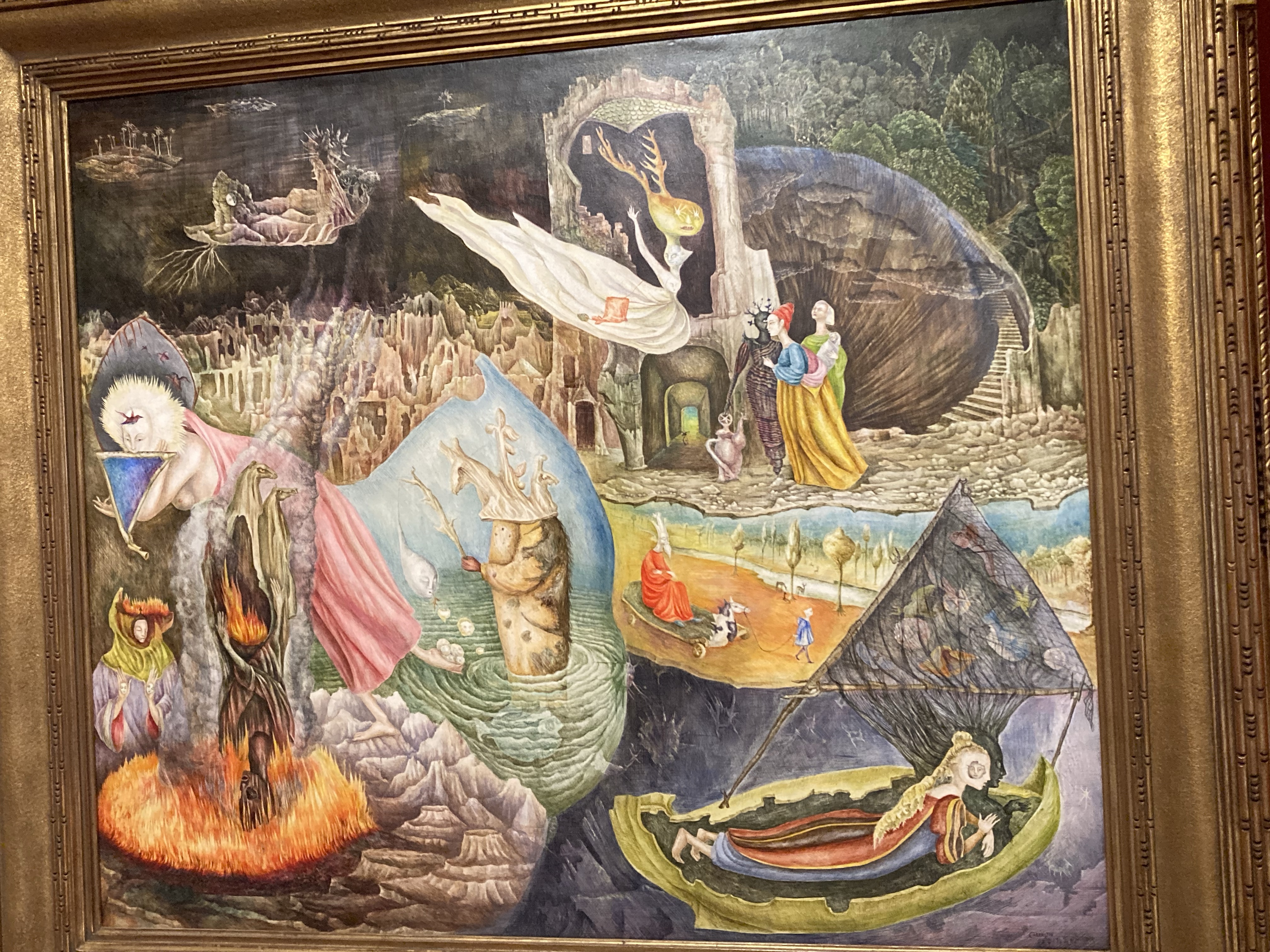 Then the exhibition develops into a show case for Leonora Carrington’s friends and fellow artists who met in Paris in the surrealist world of the 1930s. Firstly there’s Leonor Fini, an Argentinian woman brought up in Trieste and secondly Remedios Varo, a Spanish artist. The three inspired each other and became friends. When Carrington settled in Mexico City, her friend Remedios Varo was there too, both escaping the spread of Fascism in Europe. This trio of women inspired, enriched and expanded the artistic horizons of one another’s lives. I was particularly impressed with the paintings of Remedios Varo……