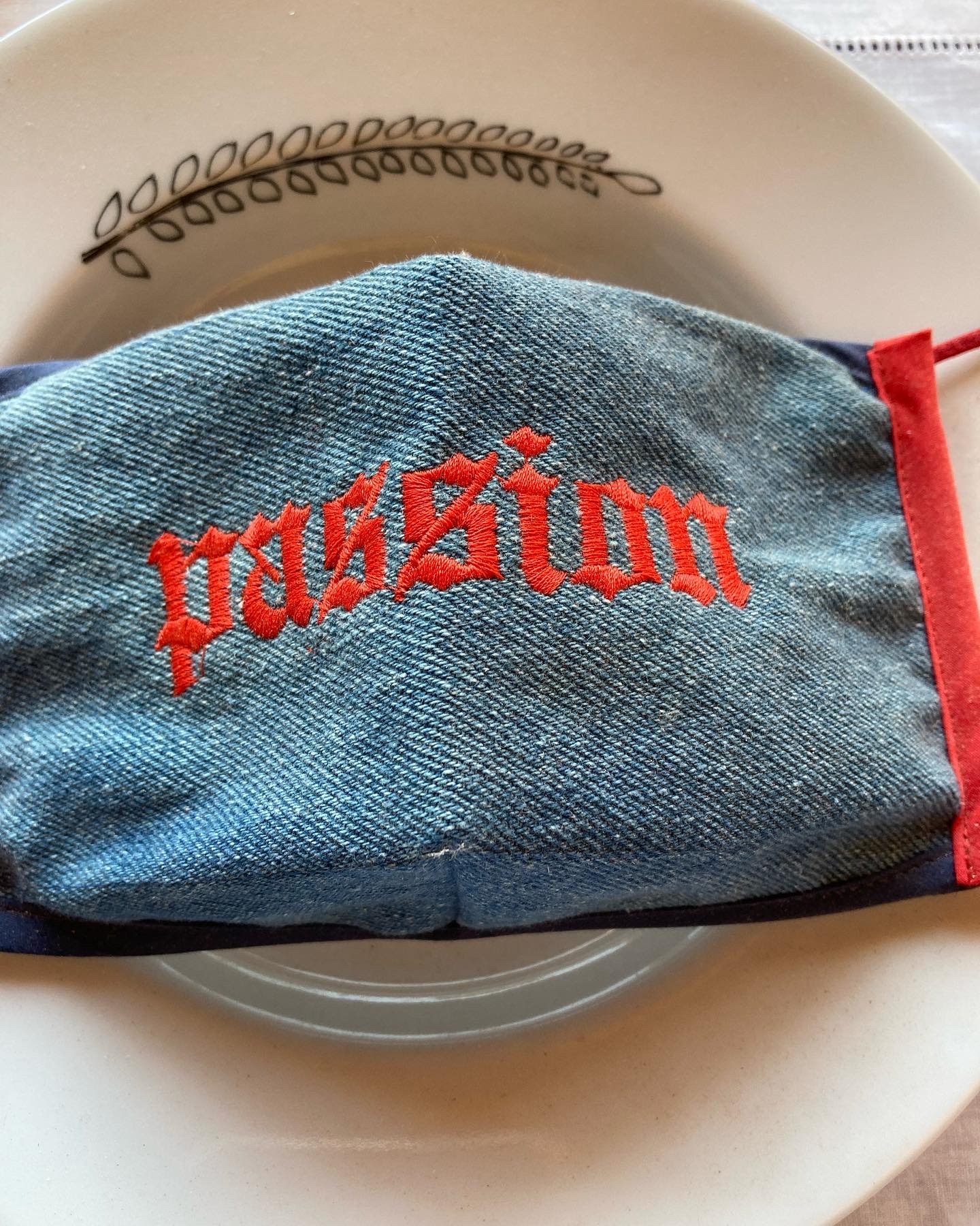 The ‘Global Supper’ invites you to look closely, to examine the place settings and to think about the countries seated around the table. The themes of the exhibit are humanity, kindness, sharing and consideration. Each country is represented by a single word embroidered onto the denim mask. In the case of Italy the word is ‘passion’. In the case of Ukraine the word is ‘strength’.