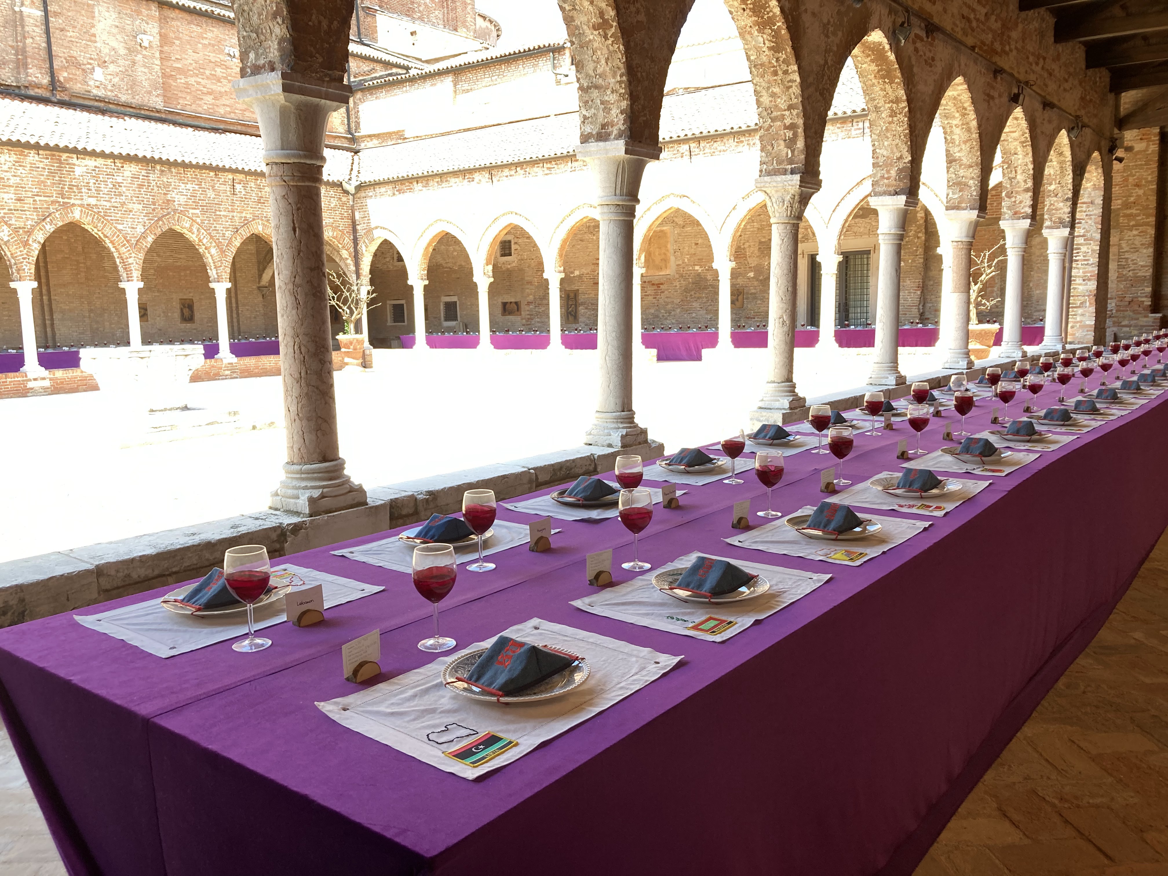 But today I’m not here for the Madonna del’ Orto Church, even though the building is imposing and the architecture is impressive. Today I’m here for Lilli Muller’s ‘Global Supper’. The ‘Global Supper’ is an art installation created and assembled in the atmospheric cloisters of the church. It consists of three long tables set out for dinner. Each place setting has an embroidered place mat, a plate, glass and a denim mask. Each place setting represents a country, there are almost 200 countries represented. Each name card gives you details of the country, population, life expectancy and GDP (a measure of quality of life). Then in a stroke of genius, the level of the wine in each person’s glass represents the standard of living in that country.
