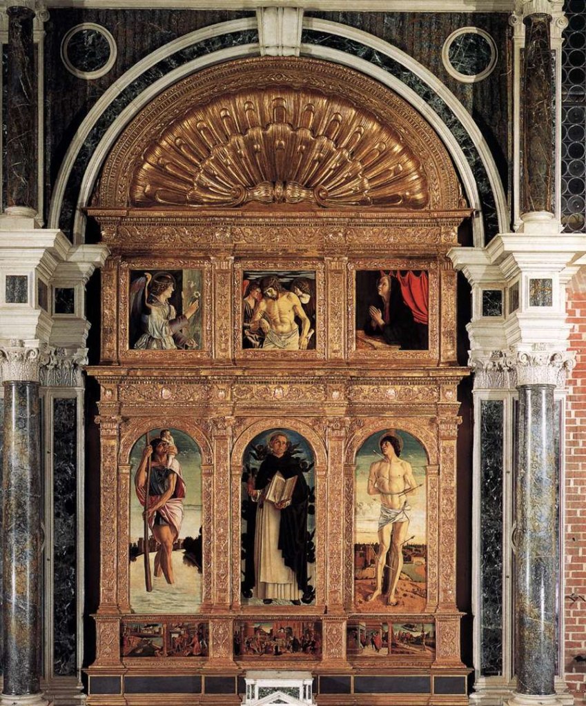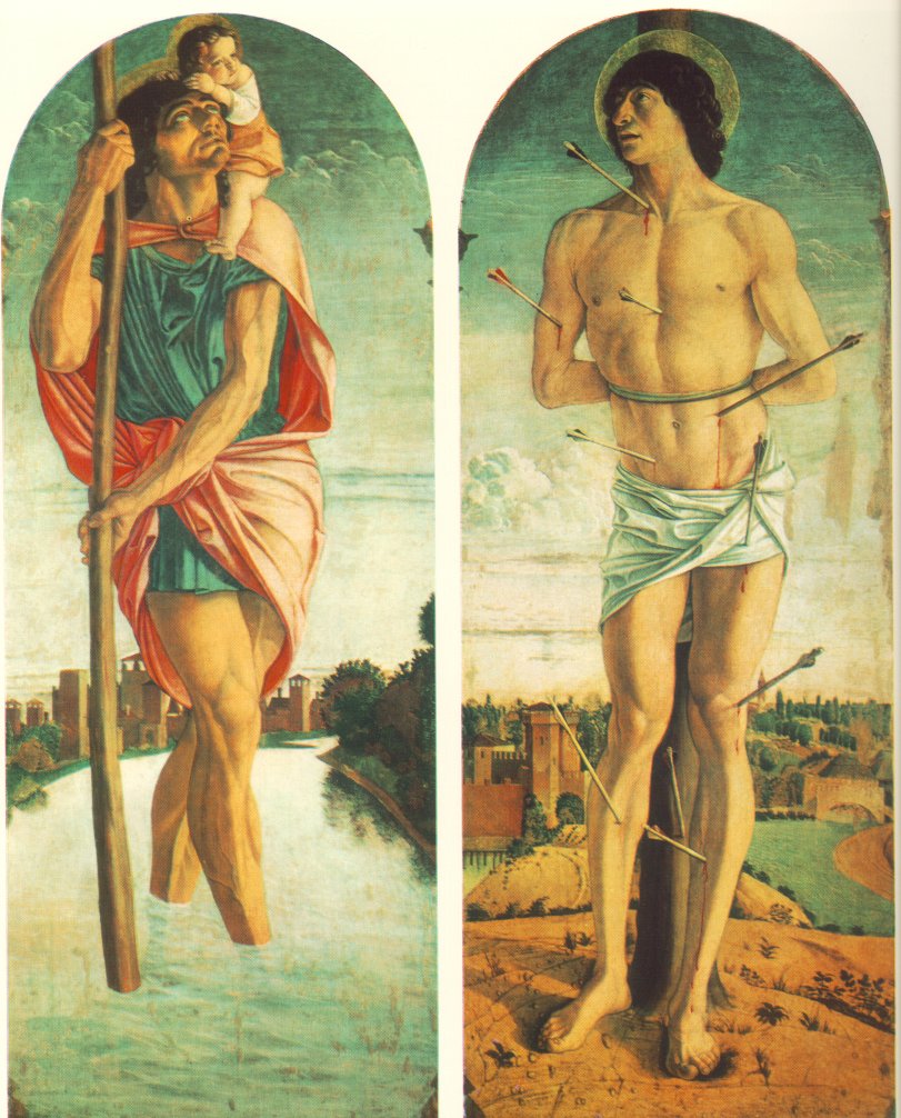 Detail Giovanni Bellini – Polittico di St Vincenzo Ferreri.jpg, a polyptych, showing panels depicting Saint Christopher and Saint Sebastian c1464-1470 (above) and San Vincenzo Ferrer (centre) – SS Christopher and Sebastiano left and right (below)