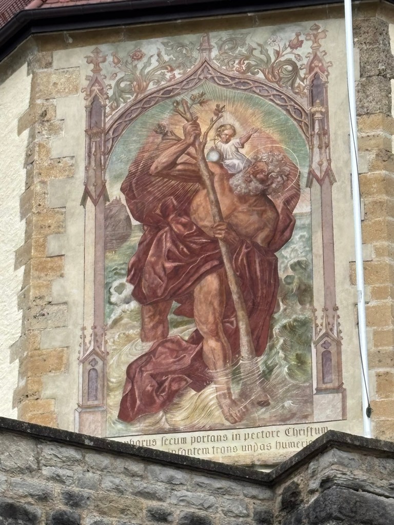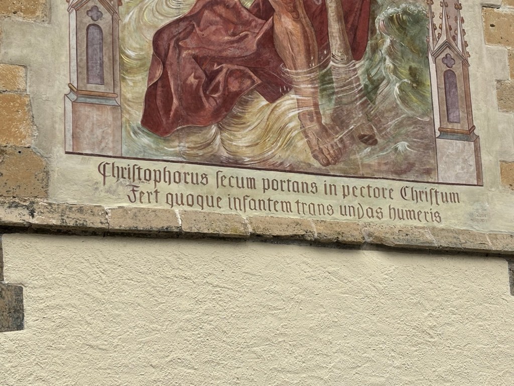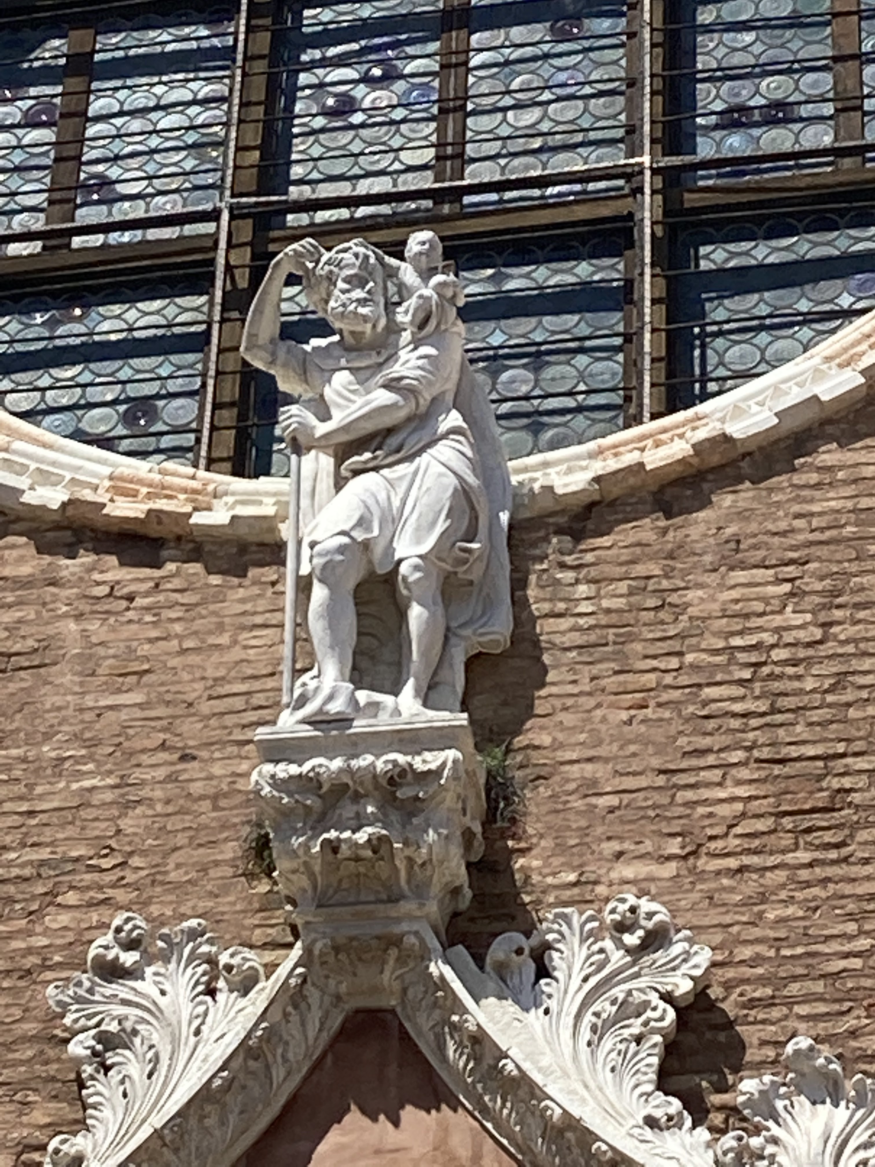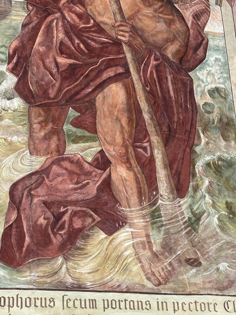 Just today (May 2025) I encountered St Christopher again on the facade of the Holy Cross Collegiate Church in the small town of Horb am Neckar, in the Black Forest of Germany. Just look at the similarities of the Christopher figure with that of Bellini’s triptych in SS Giovanni Paolo, Venice – especially the musculature of the leg.
