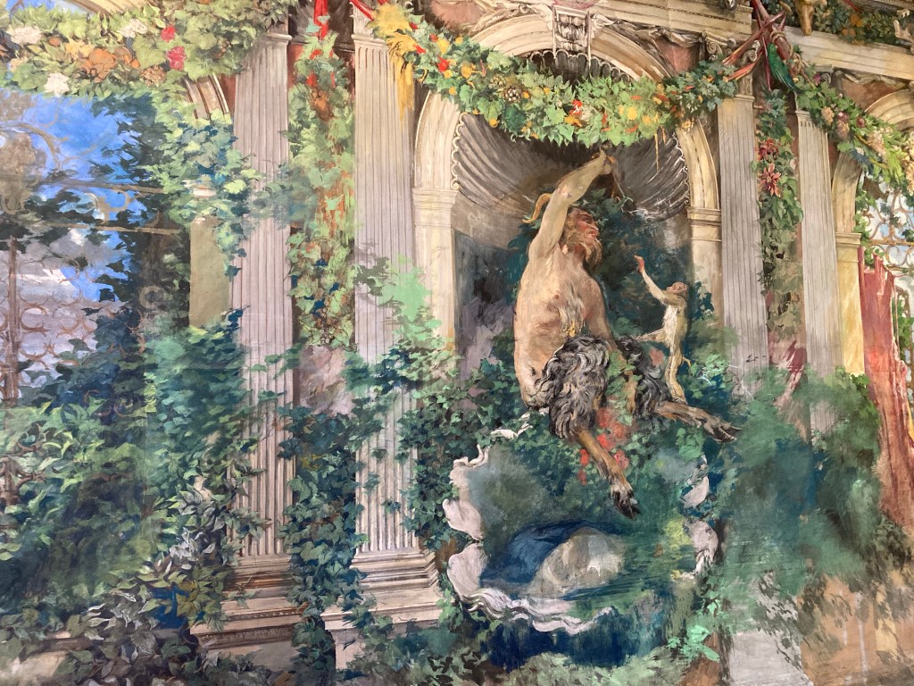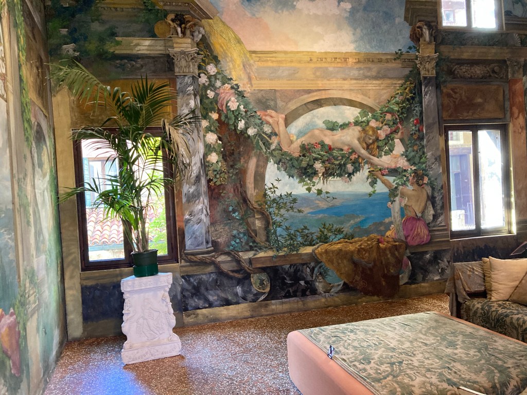 Portraits by John Singer Sargent and Mariano Fortuny (above). Below wall frescoes in Pre-Raphaelite style, Palazzo Orfei (Fortuny’s home in Venice).