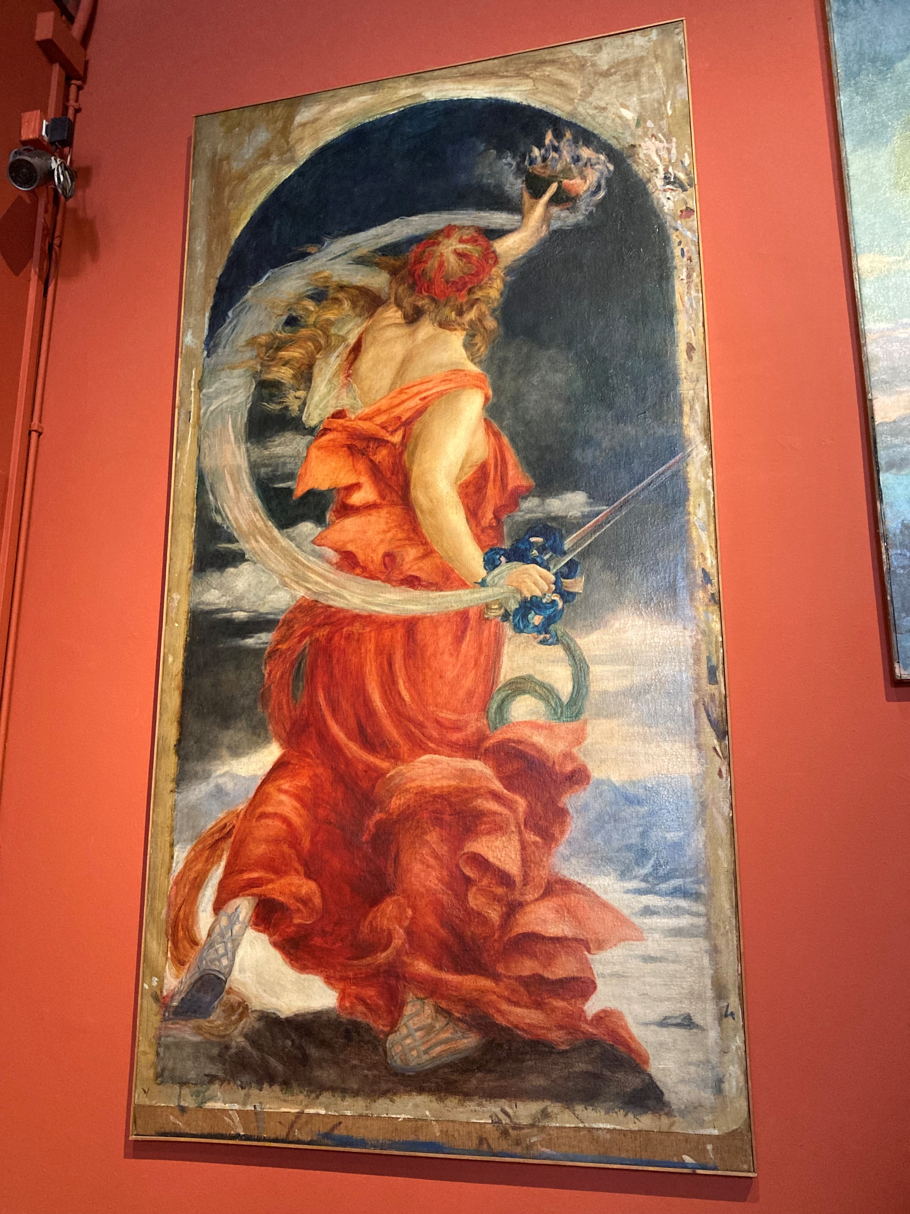 Strolling through the Palazzo Orfei, just before Christmas, I was struck by a painting next to a door, linking the winter garden with the main salone of the house. A magnificent, full-sized portrait of a female warrior, sword in hand, triumphant in her flowing gown. Her hair tumbling over her left shoulder, gorgeous golden tresses, known in Venice as ‘rosso tiziano’, Titian red. The muscular, dynamic pose of the body reminded me of several goddess portraits by Lord Leighton. I thought it would be interesting to consider the portraits side by side.