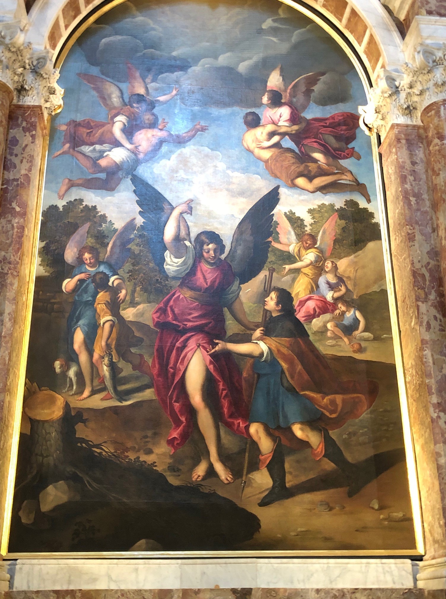 BACK TO VENICE and I’m struck by the importance of angels in our collective imagination. The whimsical and appealing idea that angels offer us wisdom, guidance, healing and friendship. In the Church of the Gesuiti, just round the corner from my morning stroll, there’s another painting about angels transporting souls to the heavens. This painting is by Jacopo Palma il Giovane (1544-1628) and for me it is filled with empathy, emotion and joy. The Guardian Angel is instructing the young boy, who gives the angel his full attention, it could easily be Tobias. At first I can’t see a boy and a fish but it doesn’t matter, my imagination fills in the rest. Perhaps I have to look more carefully. In the background other angels are transporting souls to the heavens. The scene is happy, joyful and kind. There’s a dynamic element to the painting, a level of optimism that is compelling and endearing. Looking again at the painting I suddenly notice on the left hand side of the painting, in the middle background is Tobias with his fish and his angel.