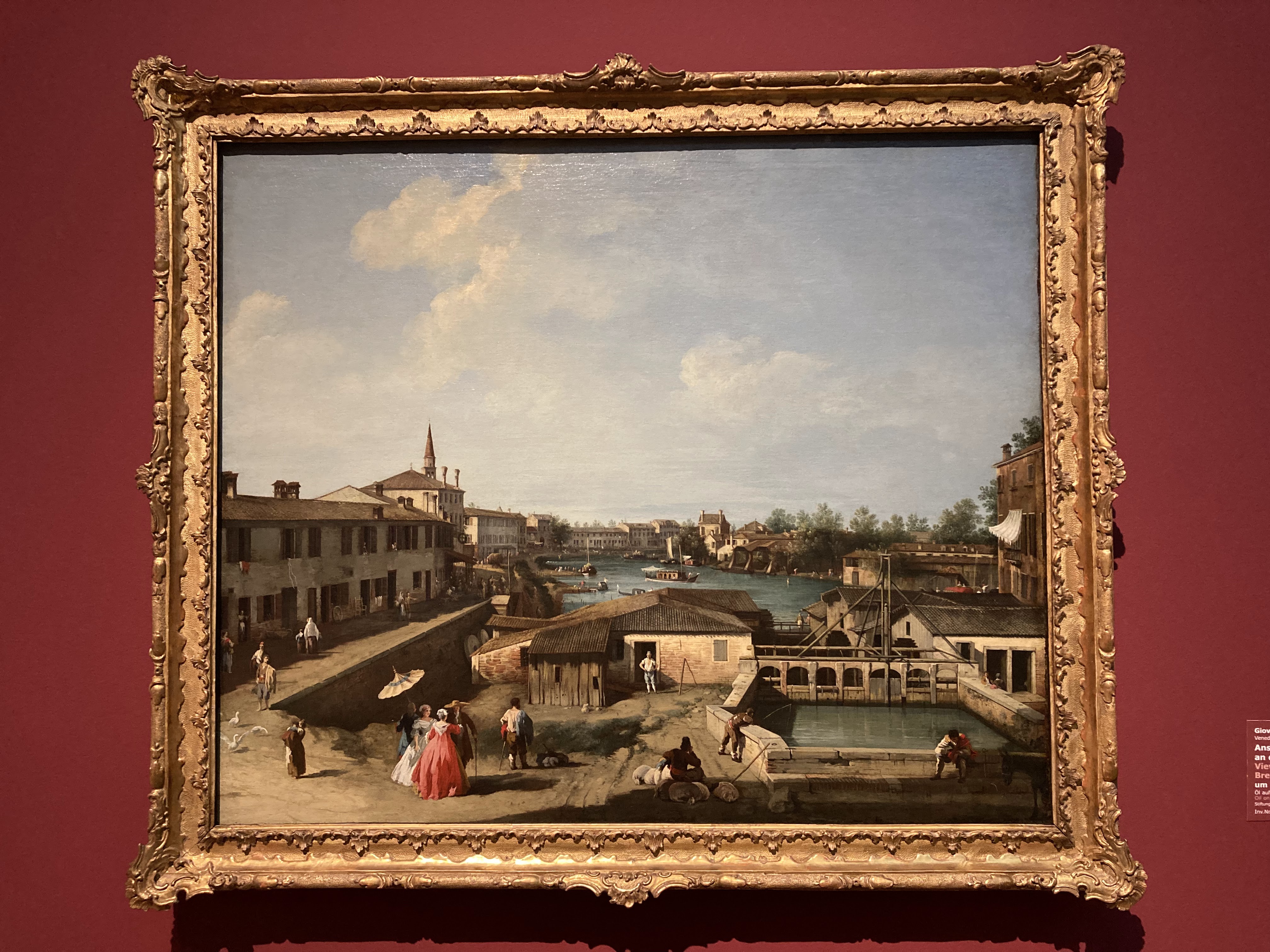 At first glance it looks identical to the canvas in The Ashmolean (Oxford). However the one in Stuttgart is properly displayed, correctly lit and a joy to behold. It hangs at eye level making it very easy to examine carefully the characters, colours and perspectives of the painting. It is easy to observe the small group, two ladies and two gentlemen standing on the left hand side of the canvas. One lady is being shielded from the sun by a parasol. There’s a young man sitting on the wall, with the mill pool behind him. There’s a boy fishing. The overall painting is of the mill and water wheels built and operational on the River Brenta in the early 18th century. The river behind is filled with boats including the famous pleasure cruiser known as the ‘burchiello’. This was a boat that sailed between Venice and Padova offering it’s aristocratic passengers entertainment and music, gambling, flirtations and all manner of social amusements. To the left in the top of the picture is the bell tower of Dolo. One of the reason’s that this painting is so interesting for me, is that the same scene can still be viewed today, almost 300 years later (see below). This is an area I love, the meandering waterway that makes it’s way from Padova towards Venice. A place where wealthy Venetians built their summer homes to escape the heat of Venice in July and August.