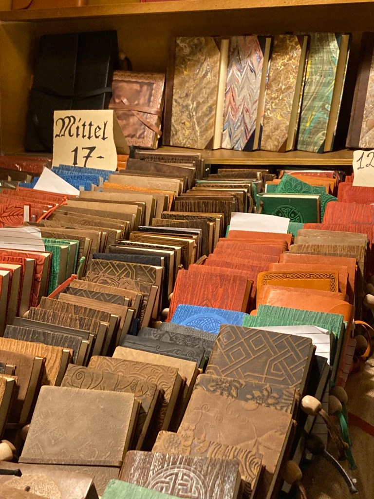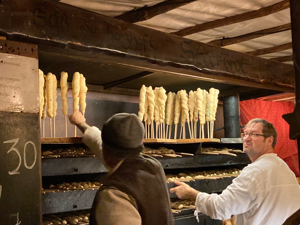 The next day we were back in a Christmas markets frame of mind. This time we took the train out of Stuttgart to the small town of Esslingen where a very special market with a medieval theme attracts visitors from all over Germany. Everything is authentic! Stall holders wear medieval costumes, there’s a fortune teller and a blacksmith, there’s even a knife sharpener. Local people have their kitchen knives sharpened here each year. For the children there’s archery, catapults and even small axes (quite sharp ones) that you throw at wooden targets.
