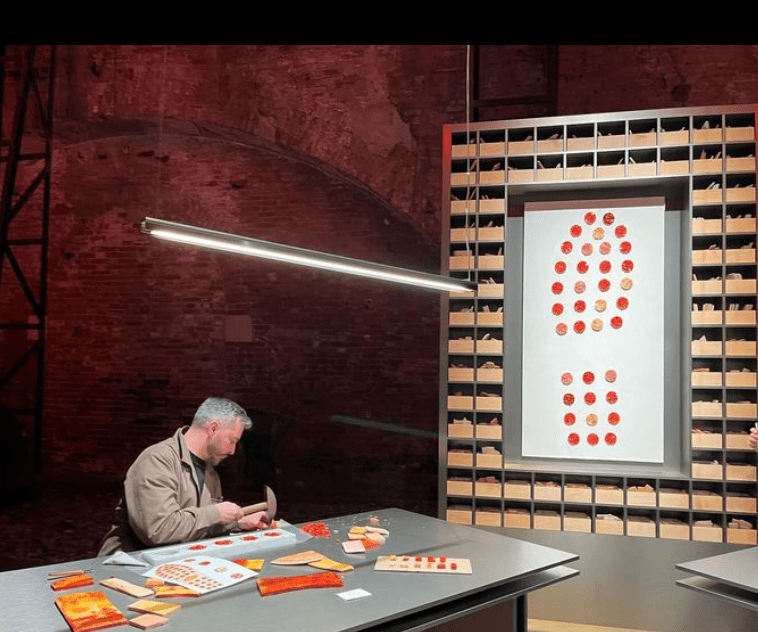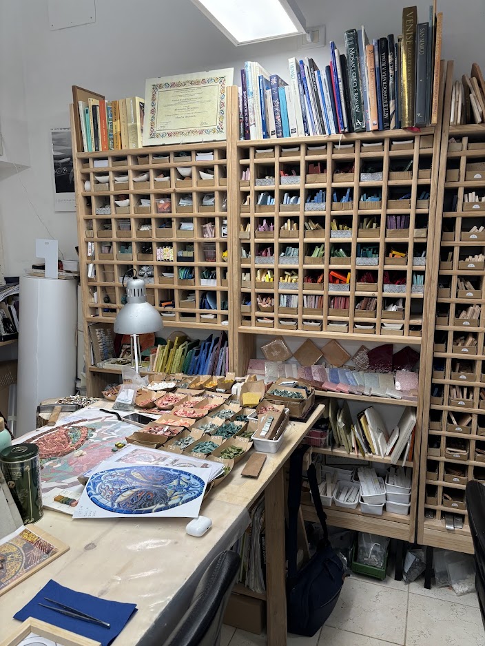 Also in the Arsenale is a small exhibit with a focus on mosaics. This is sponsored by Tod’s the Italian shoemaker and features the work of Artefact Studio. Artefact is a husband and wife team based in Venice, they are both master mosaic-makers. A recent visit to their studio in Cannaregio offered me an insight into a world of dedication and craftsmanship. Both Alessandra and Romuald are graduates of the Scuola Mosaicisti di Friuli at Spilimbergo (just an hour’s drive from Venice). Photos below show their work at The Biennale where they created the sole of a Tods shoe in mosaic, and then also some recent photos of their ‘laboratorio’ in Cannaregio.