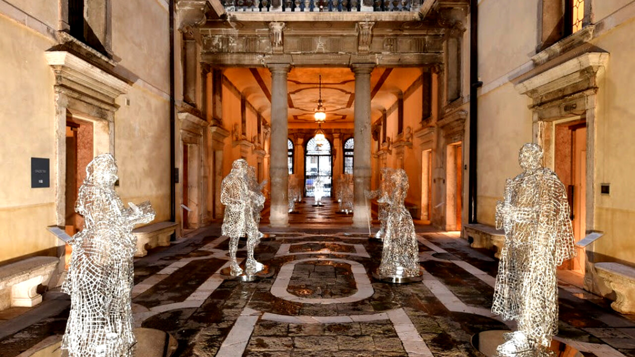 Lorenzo Quinn the Barcelona-based sculptor is back in Venice for the Biennale season. This time Quinn has fashioned a series of life-size, mesh figures identified as the ‘Anime di Venezia’ which translate as ‘The Souls of Venice’. These are to be found gracing the water-gate entrance of Ca’Rezzonico, an elegant palace on the Grand Canal, which is Venice’s Museum of 18th century art (a bit like Venice’s answer to the V & A in London).