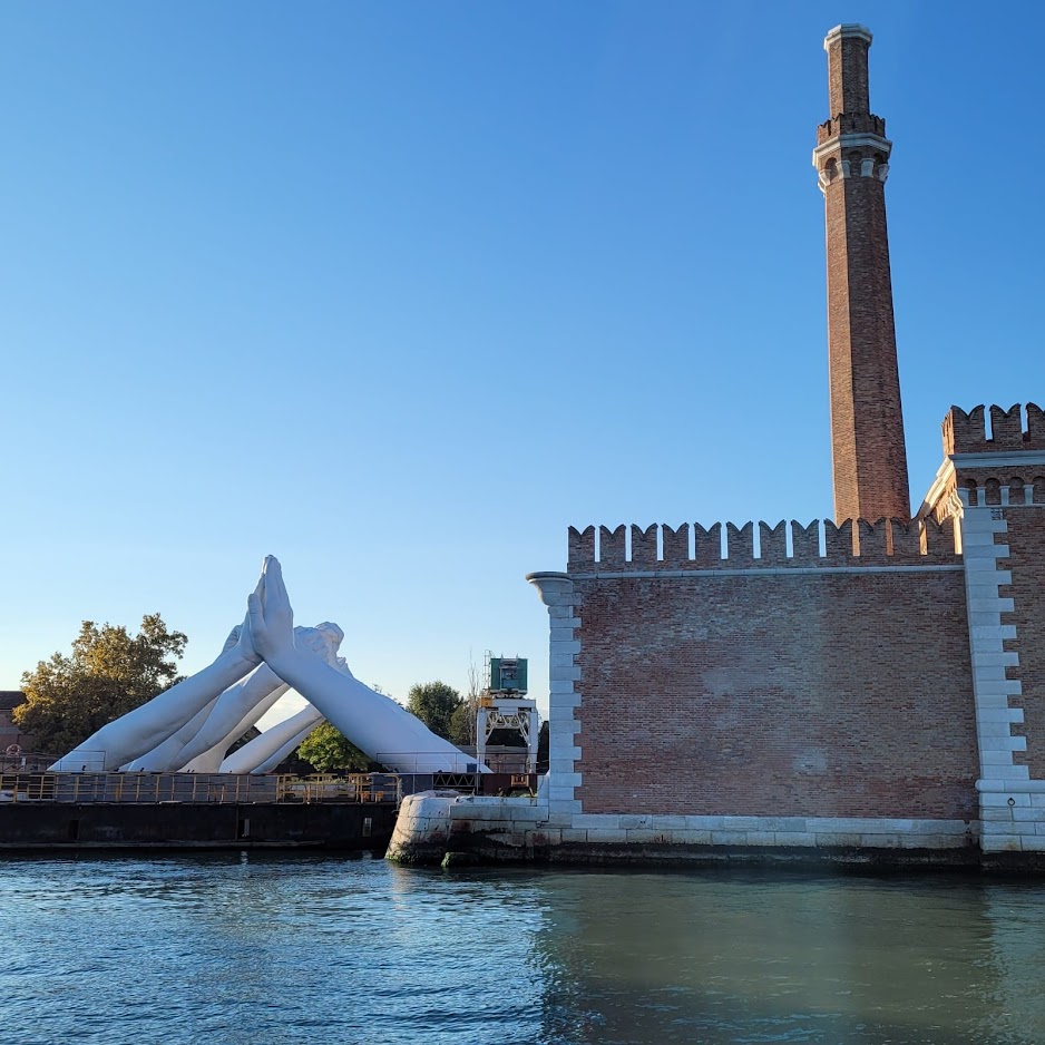 Then in 2019 Quinn was back in Venice with ‘Building Bridges’ a succession of clasped hands joined together like the steeple of a church. Whenever Lorenzo Quinn is in Venice his work always attracts controversy, in 2017 it was the debate about ‘Support’ being part of, or external to, the Biennale Event of that year. Then in 2019 the discussion was the location of ‘Building Bridges’. Quinn wanted his new exhibit to grace the entrance to Venice’s Arsenale, a beautiful waterway leading from St Mark’s Basin to the elegant threshold of Venice’s historic boat-building yards. However the city elders objected. Instead the strikingly beautiful sculpture was relegated to a dry dock location beyond San Pietro di Castello – a part of Venice that is rarely visited by tourists. Instead of the main entrance to Arsenale, Quinn’s sculpture was located round the back at the tradesmen’s entrance! However, it’s still there, nearly five years later and visitors can glimpse it in the distance as they head across the lagoon to the airport, or from one of the vaporetto services that includes Castello and Ospedale.