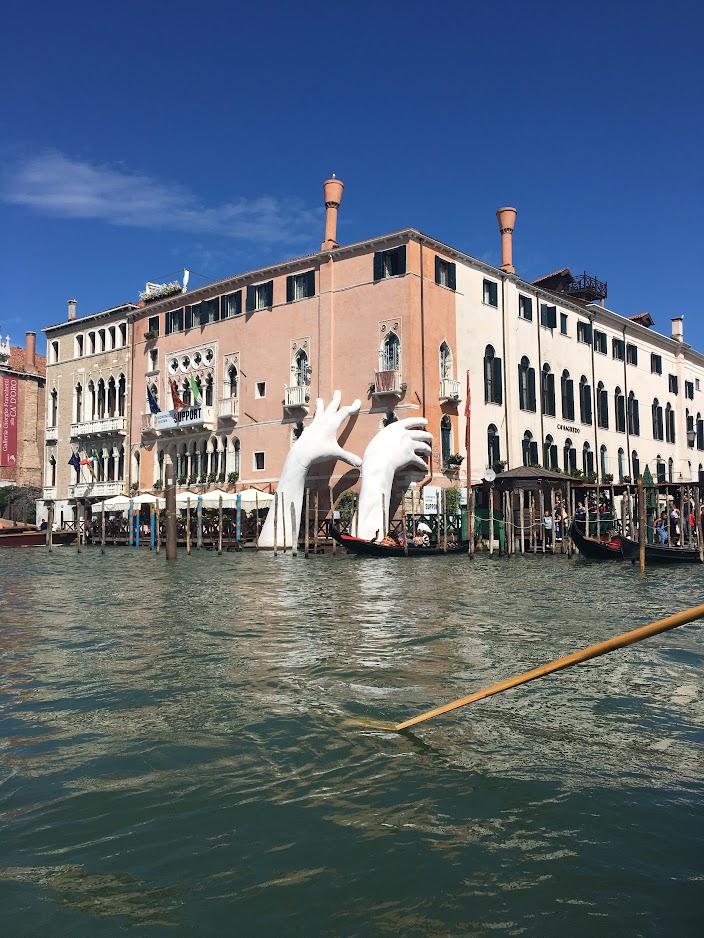 Support by Lorenzo Quinn at Ca’ Sagredo – 2017 – photo: www.educated-traveller.com