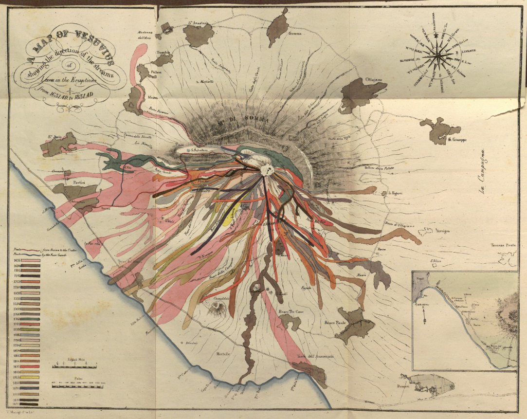 The barren crater of Vesuvius (above left) and a map showing the numerous lava flows from Vesuvius (right) from the 17th-19th centuries. The coastline of the Bay of Naples in blue.