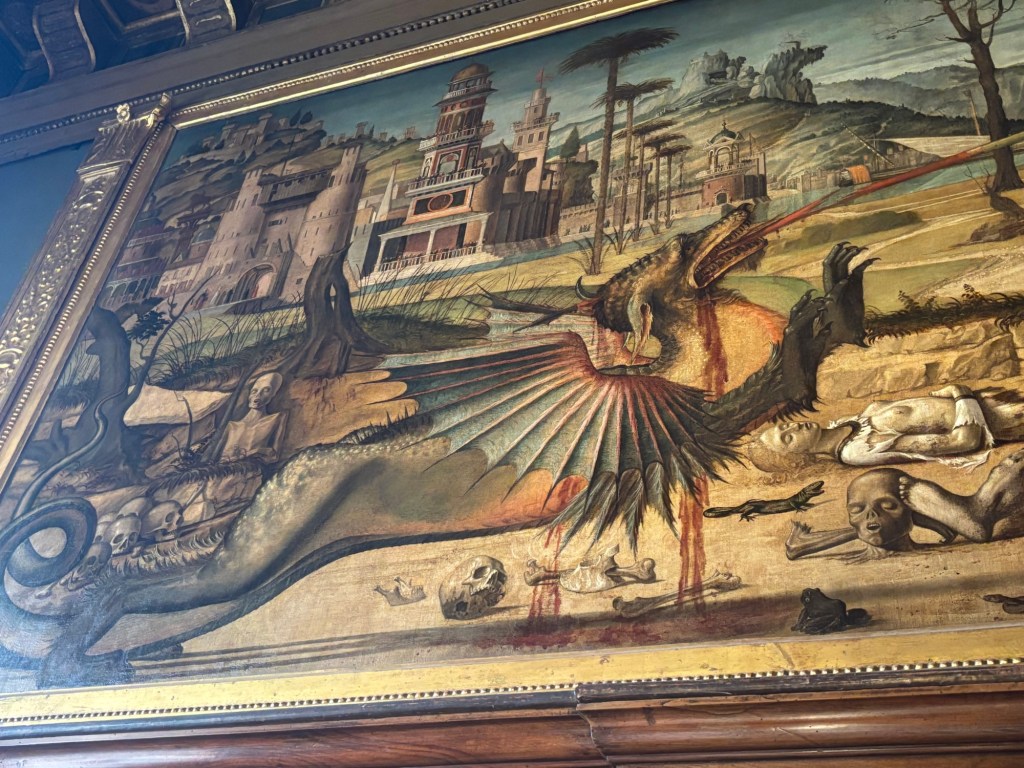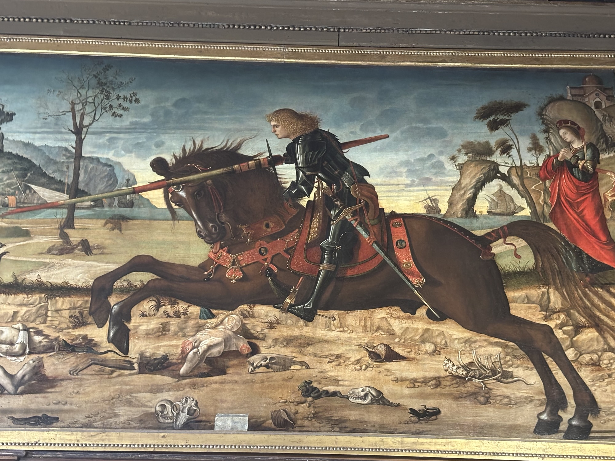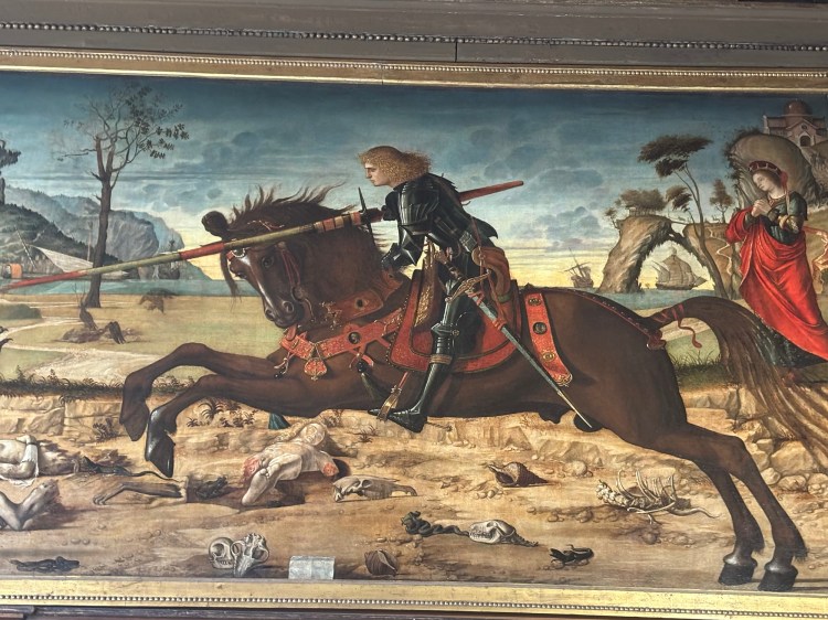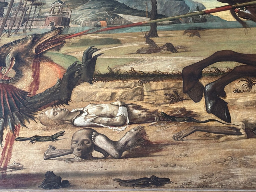 His cycle of paintings featuring the life of St George and his heroic slaying of the dragon are in the process of being restored – thanks to Save Venice – a charitable foundation based in America. His masterpiece ‘The slaying of the dragon by St George’ has been completed. The restoration which is effectively a specialist cleaning exercise has revealed a bright, detailed tapestry of symbols and information that were invisible before. George gallops towards the doomed dragon (visible in the pre-restoration image – below). There’s movement and bravery in the painting. The scattered remains of the dragon’s previous victims remind us that George has entered the dragons lair. The ground is littered with dismembered bodies. The two images below show the restored version of the painting (above) and the pre-restoration painting (below). The clarity of the images in the restored painting is truly impressive.