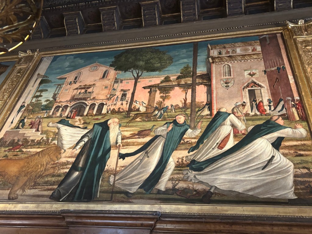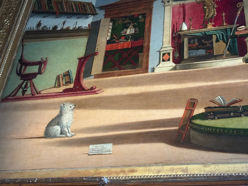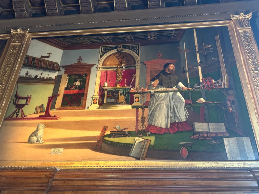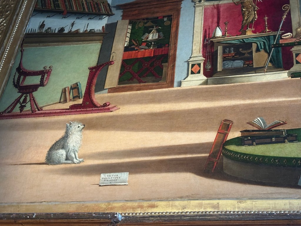 Another magnificent painting by Carpaccio is St Augustine in his study. The detail of the room and surroundings is exquisite. It is said that Carpaccio was influenced by Flemish painters like Van Eyck. A favourite of mine in this canvas is the cute little dog sitting in the middle of the room awaiting something – perhaps a little snack! There’s often humour in Carpaccio’s work.