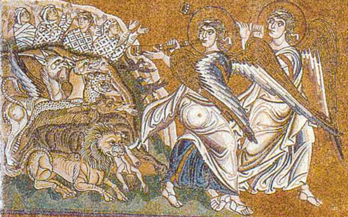 Meanwhile, for the penitent and honourable Paradise awaits; a land of milk and honey, spring flowers, shaded gardens, palm trees and peace. The characters are Abraham, seated on the far left with a small child on his knee, various ‘infants’ sidle up to his tunic (they are the innocents) children who died with no mortal sin. There’s Mary, in a gold and blue gown. Next to her is either ‘the good thief’ or Lazarus (sources differ). Then we have an angel and St Peter (carrying his keys) the first bishop of Rome. Peter and the angel are pointing to a banner or flag, showing the head of a saint (or Jesus) surrounded by hundreds of eyes. The eyes remind me immediately of Argus, the unfortunate shepherd, in Greek mythology, who was an excellent shepherd because he could never sleep, at least some of his eyes were always open and awake. We know that Greek or Byzantine craftsmen created these mosaics, so perhaps they brought Greek folklore and myths with them.