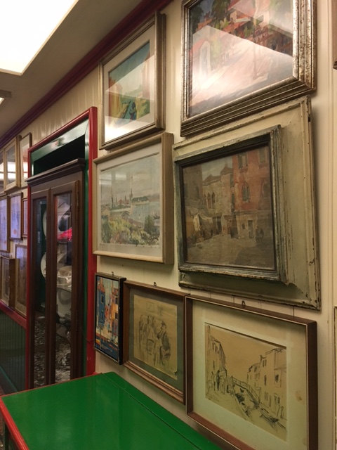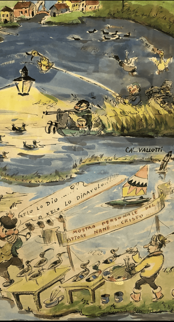 In the 1940s and 50s a group of creative types from Milan would come to the Venetian Lagoon for their holidays every summer. These artists, writers and ‘bon viveurs’ frequented ‘Da Romano’ a traditional trattoria on the island of Burano. The walls of this typical fish restaurant are filled with paintings and illustrated menus created and given by the Milanese group and other guests over the years. A favourite of mine is the cartoon above, showing the antics of the duck hunters in the lagoon. The artist shows that in many cases, the ducks have the upper hand. The detail (below centre) of duck hunting on the lagoon shows Hemingway (a cartoon version of course) having accidentally bagged a cat. For more on the ‘Art of Da Romano’ have a look at an article I wrote here – a year or so ago: The Art of Da Romano Venice