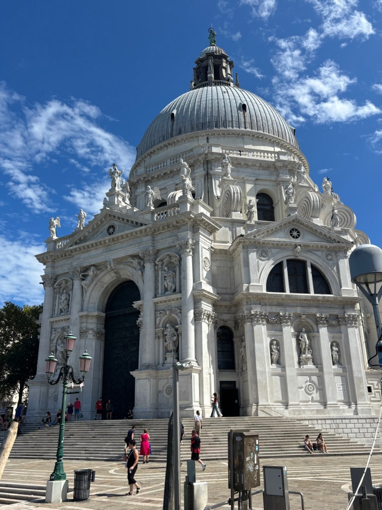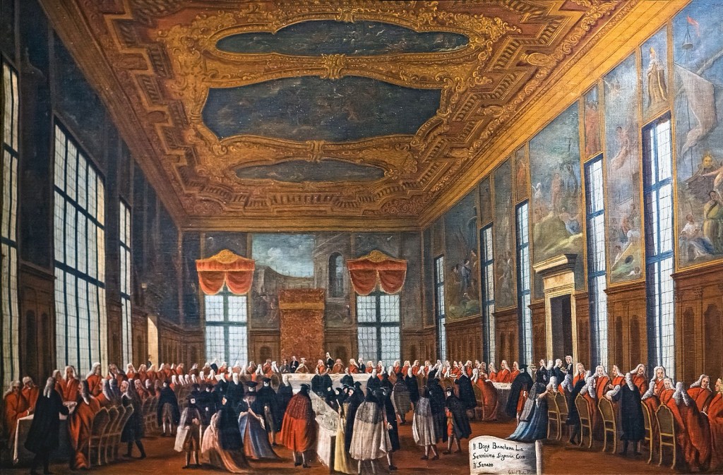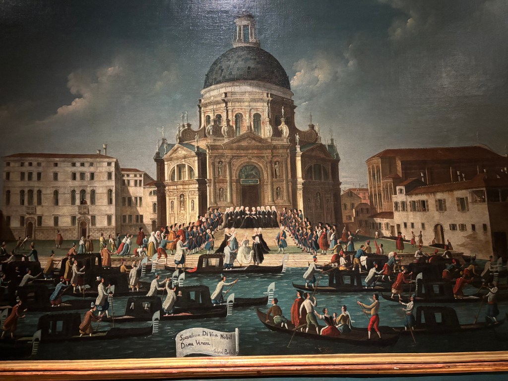 Next let’s look at ‘Wedding of a noble lady’ by Gabriele Bella. The scene is the fondamenta in front of the Basilica of La Salute. The church was built in the 1630s to celebrate Venice surviving the plague. Construction was finished in 1687. So when Bella painted this picture the church was fairly new on the Venetian skyline – only about 50 years old. The architect Baldassare Longhena created a modern ‘Baroque style’ church in the heart of Venice – reminiscent of the churches of Rome. The artist paints a detailed scene of the lady arriving by gondola at the steps of the basilica. The great and the good of Venice await her arrival on the top step of La Salute. Venice’s magnificent new basilica is front and centre of the painting with the winged lion of St Mark, the city’s patron saint, clearly visible above the entrance.