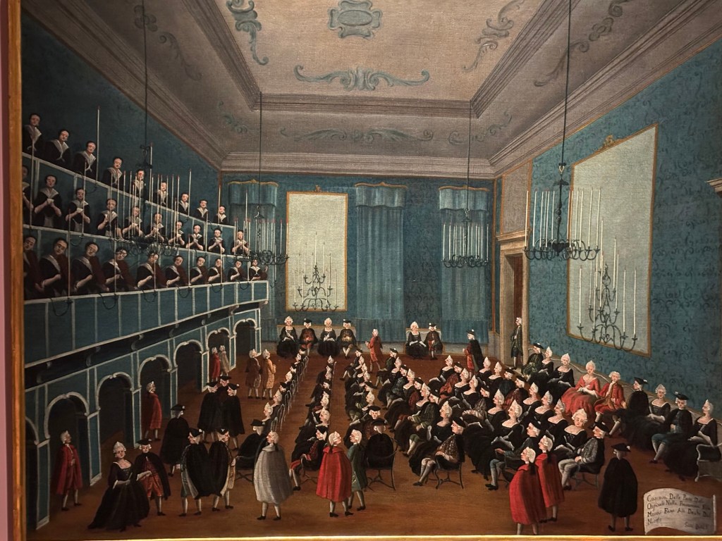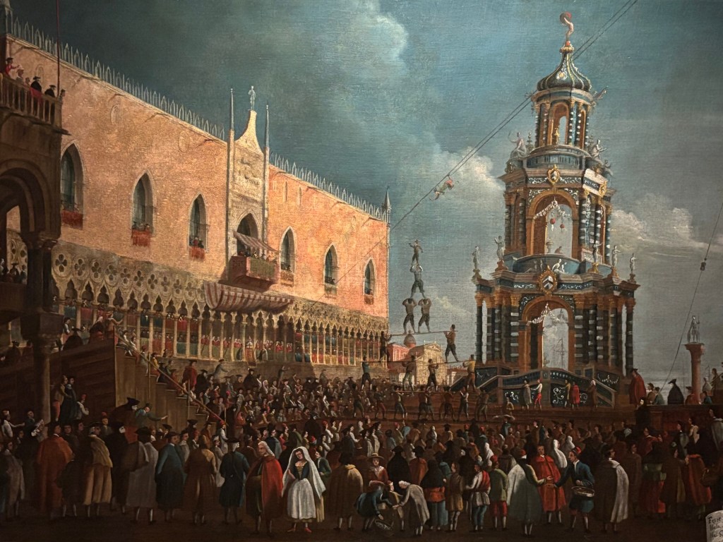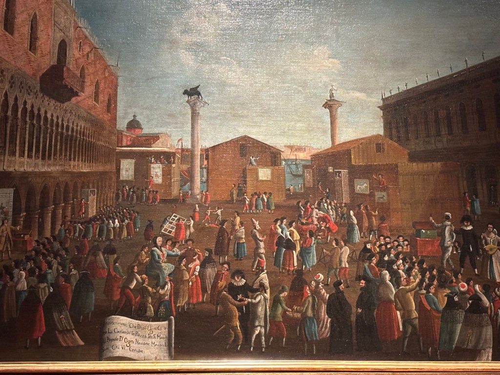 The Querini Stampalia has more than 60 paintings by Gabriele Bella – I’ve included a small selection below. Every single canvas merits close attention and consideration. The similarity to contemporary artists like Canaletto, Guardi and Longhi is striking. I particularly like looking for the endless range of hats including millinery of every kind. Dashes of red often denote a cap, scarf or even a red stocking, similar to the paintings of Canaletto.