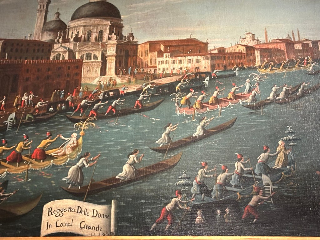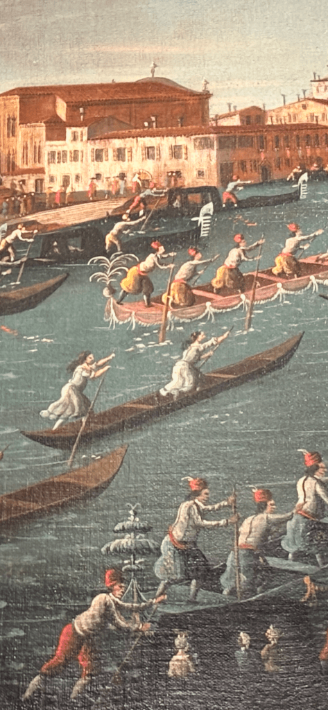 The beautiful and rambling Palazzo Querini Stampalia holds more than sixty of Gabriele Bella’s paintings. They hang in their own dedicated room on the second floor – although they may have been moved for this exhibition. The artist primarily painted events and activities in the city. These superb historical documents show us a vast range of snapshots of Venice in the mid-1700s. Let’s start with a favourite of mine, a painting of the Women’s Regatta – possibly in 1760 (see below).
