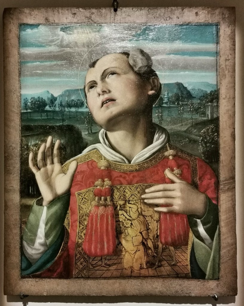 Saint Stephen is often painted with a tonsured head because this was the traditional hairstyle for deacons and clergy in Western medieval art, symbolizing his role in the early Christian church and his devotion to God.