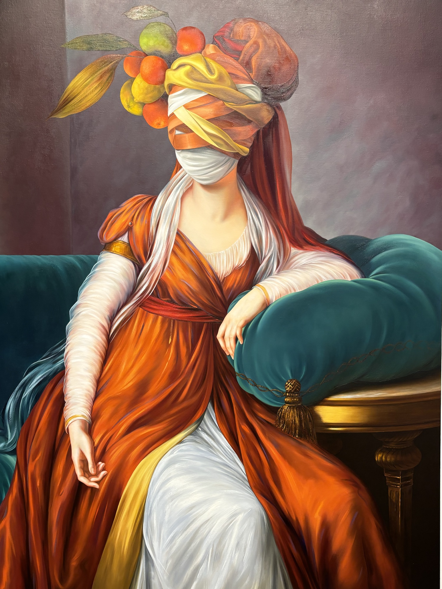 THE POLISH ARTIST – Ewa Juszkiewicz, exhibiting a series of beautifully constructed portraits of women with their heads and faces covered. This event at Palazzo Cavani was disturbing and surreal. What’s in a face you might ask, well not much if the artist is to be believed. The impact of these faceless portraits was extraordinary. All the paintings were modern reworkings of famous portraits, filled with colour and rich fabrics. The one big difference being that their faces are completely covered. These works were imprinted on my mind permanently. I wrote about Eva here: Venice Biennale – Foreigners Everywhere