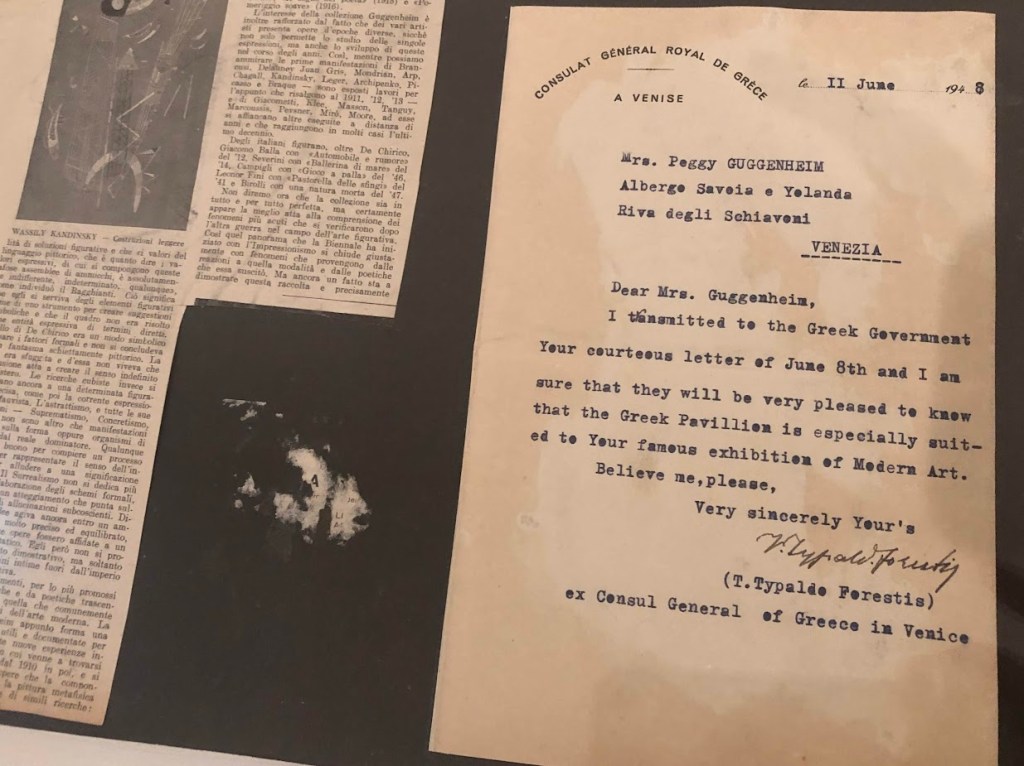 IN 1948 PEGGY GUGGENHEIM was invited to display her private collection of modern art in the Greek Pavilion at the Venice Biennale. This was just after the Second World War. At the time Greece was engulfed in a civil war (1946-1949) and was not in a position to provide art for the event. So instead Peggy Guggenheim was invited to display her already famous collection in the Greek Pavilion. A letter to Peggy, dated June 1948 was on display at The Guggenheim, Venice a few years ago (see below). The Greek Pavilion is still standing in the gardens of the Biennale in Venice – it was built in the 1930s.